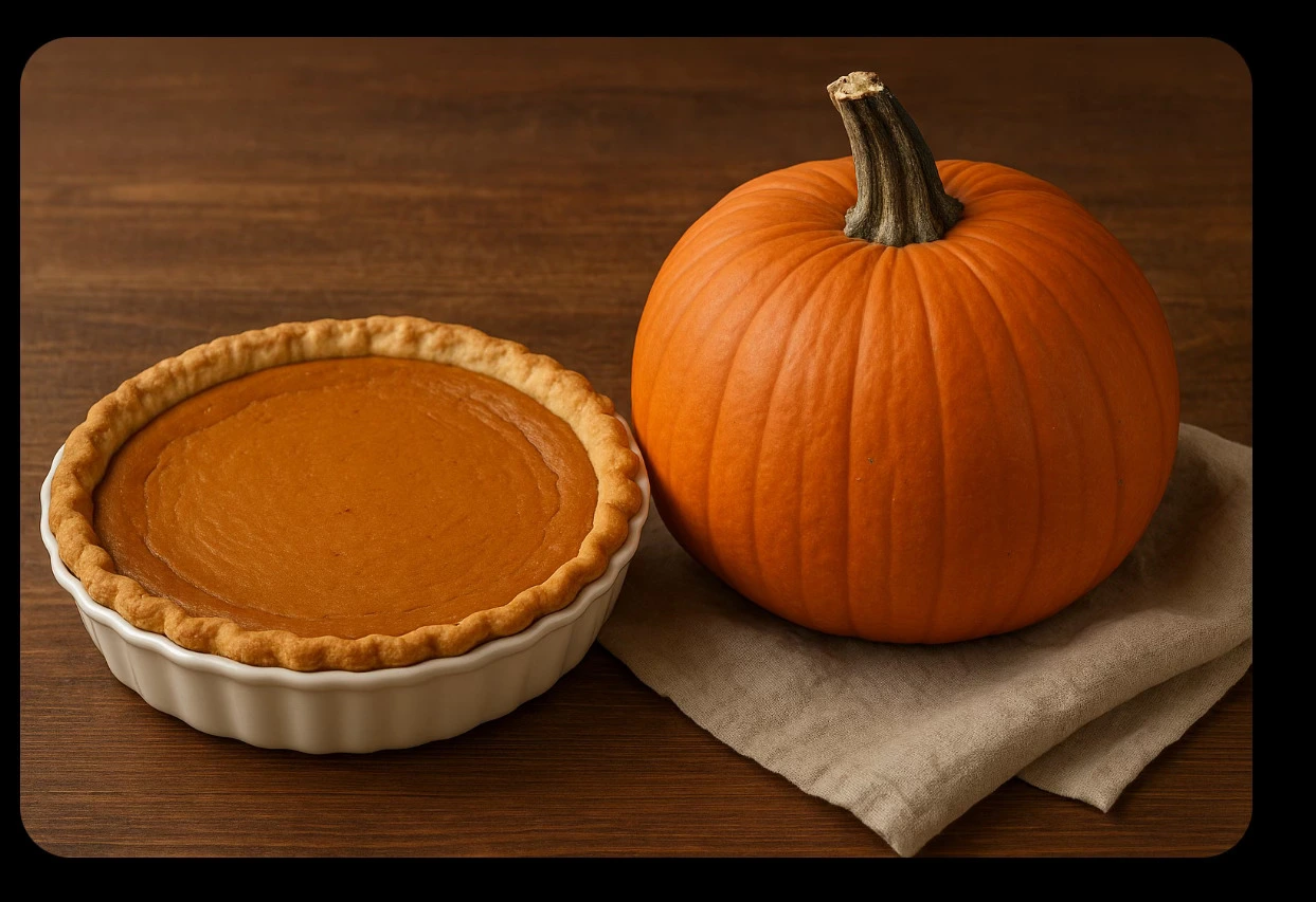 Sugar pumpkin 또는 pie pumpkin으로 불리기도 하는 다양한 호박들이 파이와 라떼 그밖의 여러 음식의 재료로 사용된다. Whole Food Markets는 Cucurbita moschata종의 하나인 Dickinson pumpkin을 사용해 파이를 만든다(오른쪽 이미지 보다는 우리나라 늙은호박처럼 색이 덜 붉고 조금 긴 편이다). Dickinson pumpkin은 미국에서 캔으로 많이 유통되며 주로 파이 속재료로 사용된다고 한다.
