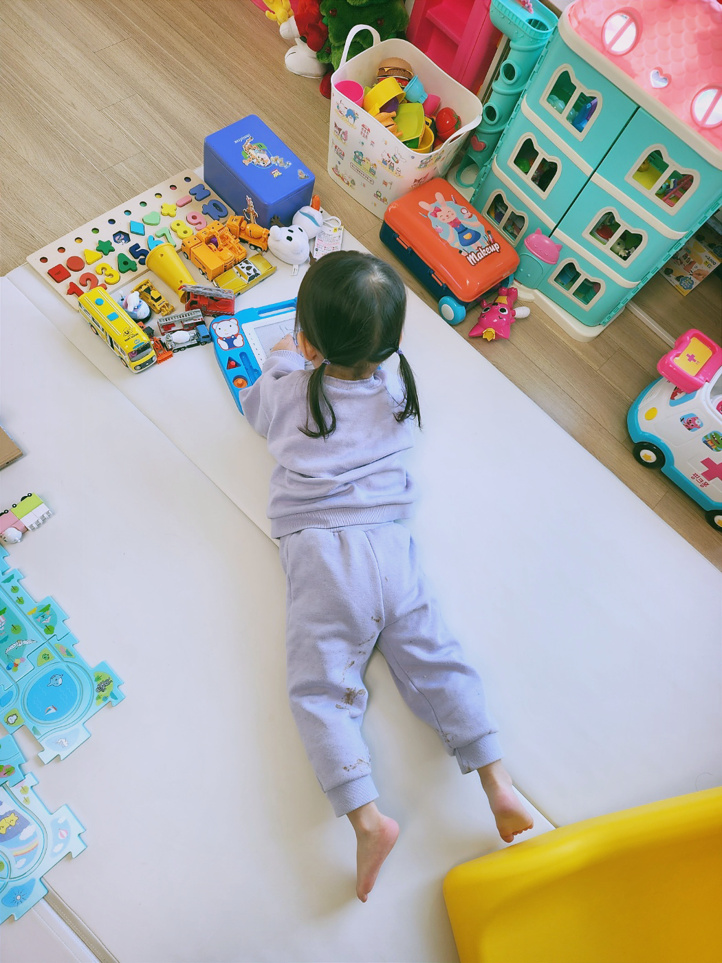 5시 퇴근 후 빠른 걸음으로 걸으면 5시 반에 집에 도착한다. 친구가 오지 못하는 요일에는 내가 직접 어린이집에 가서 아이를 데리고 온다. 집에 와서 밀린 빨래와 집안일, 저녁 준비를 정신없이 하다 보면 어느덧 밖은 어둑해진다. 아이가 열이 나거나 컨디션이 안 좋은 날도 꽤 있었지만, 항상 아이의 기분은 좋았다. 아침에 눈 떴을 때 엄마가 없었고, 엄마가 하원길에 직접 가지 못했음에도 아이는 내게 이전과 다름없는 웃음을 보여주었다. 밥을 먹지 않겠다고 떼를 쓰는 태도도 여전하다. 드디어 아이와 오롯이 둘이 있을 수 있는 시간. 그럼에도 나는 한껏 지쳐있어서 조금 놀아주다가 드러눕거나, TV를 틀어버린다. 그렇게 몇 시간 버티면 남편이 퇴근한다. 남편이 오면 따뜻한 물을 받아 아이와 목욕을 하고, 한두 시간 더 놀다 잠이 든다.