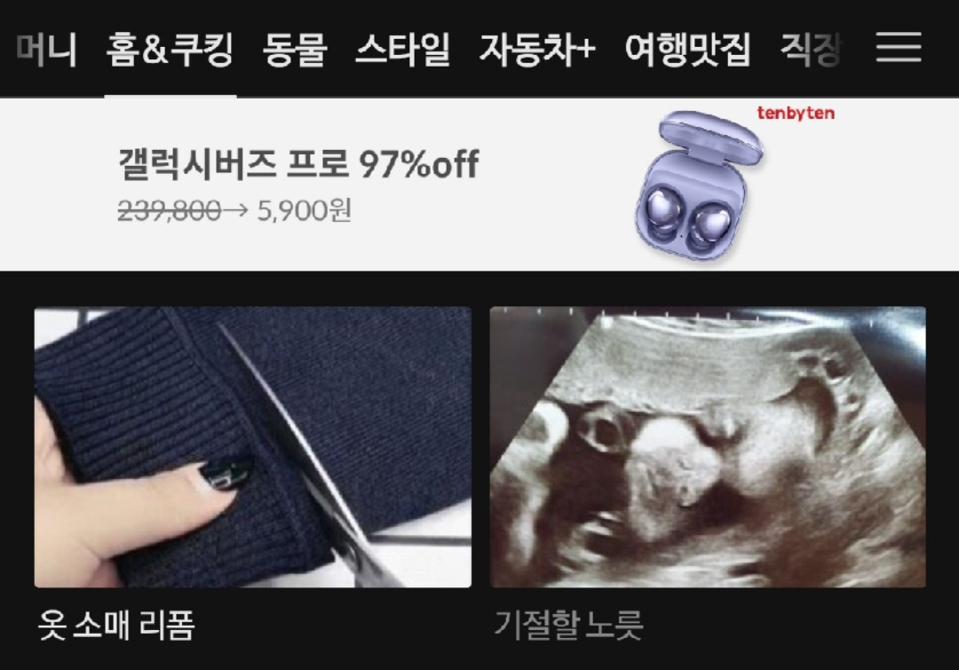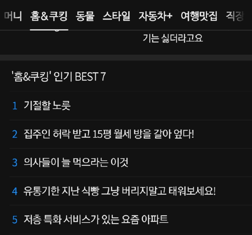 보통 포털 메인에 노출시켜 주는 것은 길어야 하루이틀인데 며칠째 조회수가 꾸준히 늘고 있었다. 물론 첫날만큼 미친듯이 늘지는 않았지만. 선배가 캡쳐해 준 이미지를 보니 이번엔 '홈&쿠킹'에 노출이 되었나보다. 집 얘기도, 요리 얘기도 없지만 나약한 임산부 이야기라 흥미가 갔던걸까. 그 다음 날부터는 '홈&쿠킹 인기 best’에 1위로 올라 거의 일주일동안 노출이 되었다. 거기에 추가로 카카오톡 뉴스탭에까지 노출되었다.