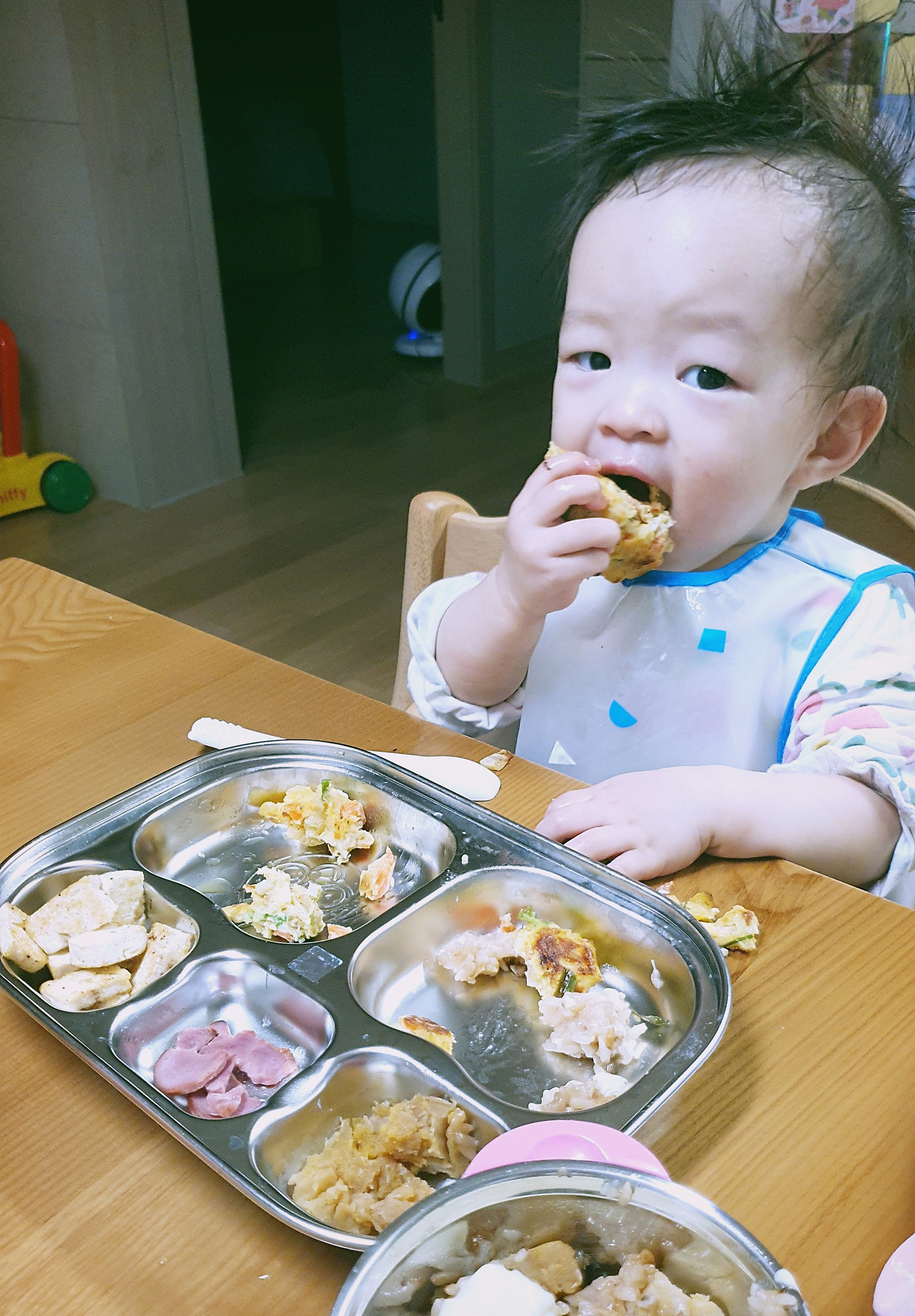 아이의 쉼 없는 요구사항, 새로운 반찬을 먹이겠다는 의지, 덜 어지럽히면서 주어진 양을 다 먹게끔 유도하는 과정. 아기의 요구와 엄마의 의지가 은근하게 기싸움을 하는 식사 시간. 항상 결말은, 아기는 만족스럽고 엄마는 어딘가 찜찜하게 끝나곤 한다.