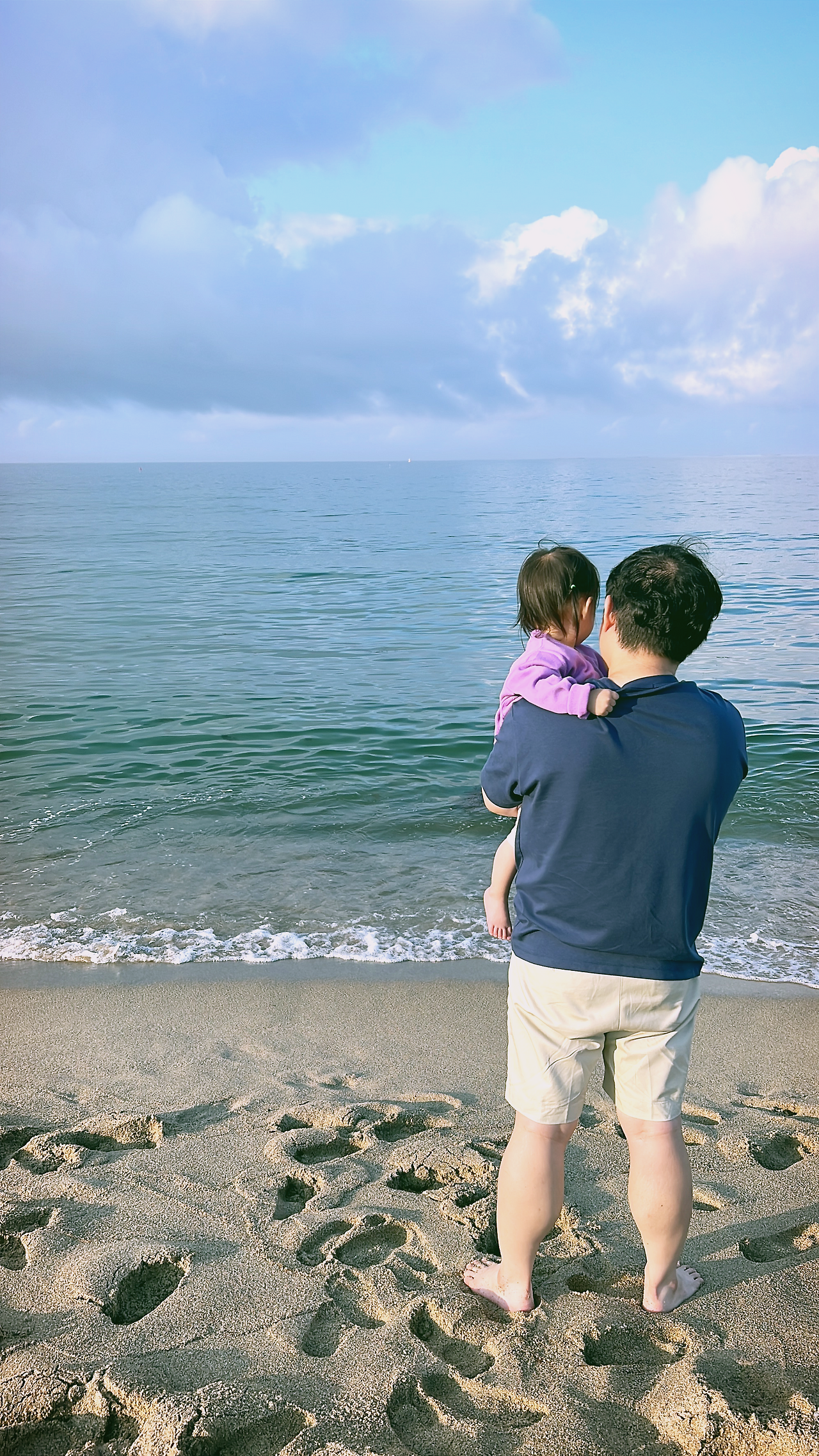 집에서 나온 지 4시간이 지났지만 우리의 일정은 끝나지 않았다. 근처에 있던 해수욕장으로 향했다. 바다를 좋아하는 남편을 위해 온 곳인데, 남편은 어딘가 지쳐 보인다. 아랑곳않고 아이와 백사장을 밟았다. 백사장 위에는 커다란 그네가 있었다. 맑은 하늘과 넓은 바다를 바라보며 그네를 탔다. 일말의 스트레스도, 걱정도 없는 맑은 기분이다. 아이는 바닷물이 무서워 앙 울기도 했지만 이내 아빠 품에서 평안을 찾았다.