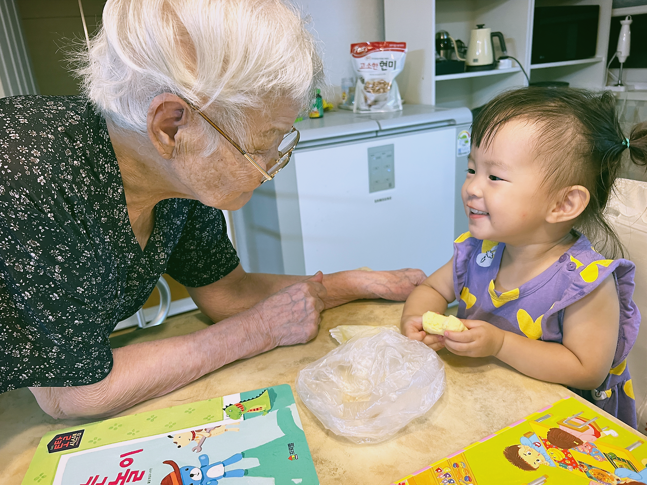 손녀인 내가 딸아이를 데리고 2주 간 친정에 머무는 동안, 할머니는 매일 증손녀의 얼굴을 새로운 듯 바라봤다. 소리 지르는 할머니의 목소리가 도리어 구연동화처럼 느껴져 재밌었는지, 딸아이는 증조할머니 얼굴만 보면 큰 소리로 까르르 웃곤 했다. 방금 전까지 소리치던 할머니도 어렴풋 증손녀의 웃는 얼굴을 마주하면 이내 따라 웃으셨다. 몇 번을 말했지만 여전히 기억 못 하는 증손녀의 이름은, 가장 어린 손녀의 이름으로 대체되곤 했다. 그럼에도 할머니와 딸아이는 둘만의 즐거운 시간을 보냈다. 이제 두 돌이 되어 못 하는 말이 없는 우리 아가는 '왕할머니'를 부르며 할머니가 드셔야 하는 영양 음료의 빨대를 꺼내 구멍에 꽂은 뒤 정확히 할머니 입에 가져다 드리고, 여러 알의 약도 흘리거나 몰래 훔쳐먹지 않고 얌전히 할머니 손 위에 올려두기도 했다. 그렇게 다가가서는 할머니 얼굴에 자신의 얼굴을 들이밀며 가만가만 웃는 것이었다.