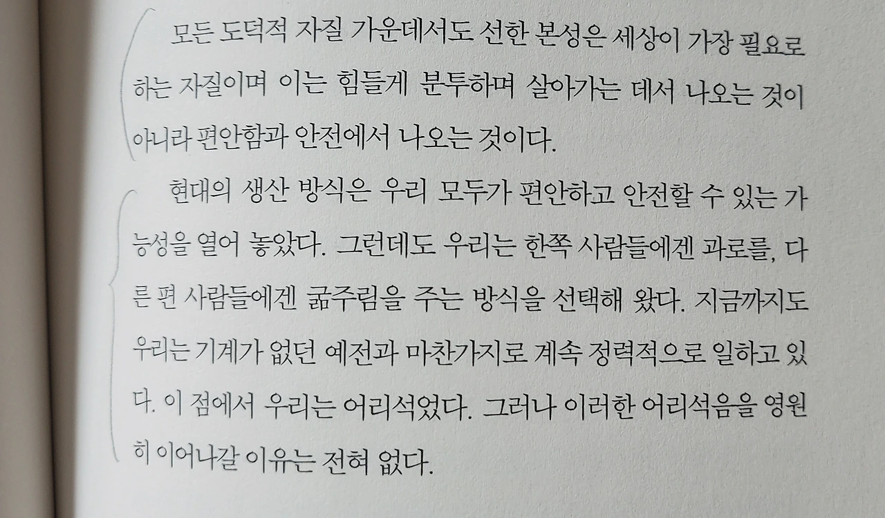 열심히 일하는 것이 본분이라는 윤리는 지배의 비용을 줄게했다는 그의 말에 고개 끄덕여진다. '여가'란 문명에 필수적이다. 현대 사회는 기술의 발전으로 공정하게 여가를 분배할 수 있게 되었다. 그러나 일은 '본분' 즉 '의무'이므로 '사람은 그가 생산한 것에 비례해 임금을 받는 것이 아니라 근면성으로 대표되는 그의 미덕에 비례해 임금을 받아야' 한다. 때문에 여가는 분배되지 않는다. 그것이 '일의 풍속'이다. 그래서 생산성이 발달해 8시간 노동으로 두 배의 물건을 생산해도 노동 시간을 4시간으로 줄이지 않는 것이구나. 모두가 4시간씩 일했을 때 나올 여가는 창출되었으나 결론은 실업이란 고통의 '여가'가 된다. 과잉 생산되어 파산 업체가 나오더라도 '풍속'은 유지되어야 하기에. 물론 나머지 사람들은 여전히 과로에 시달린다. 여기서 '풍속'이란 말은 정치적 함의로 들린다.