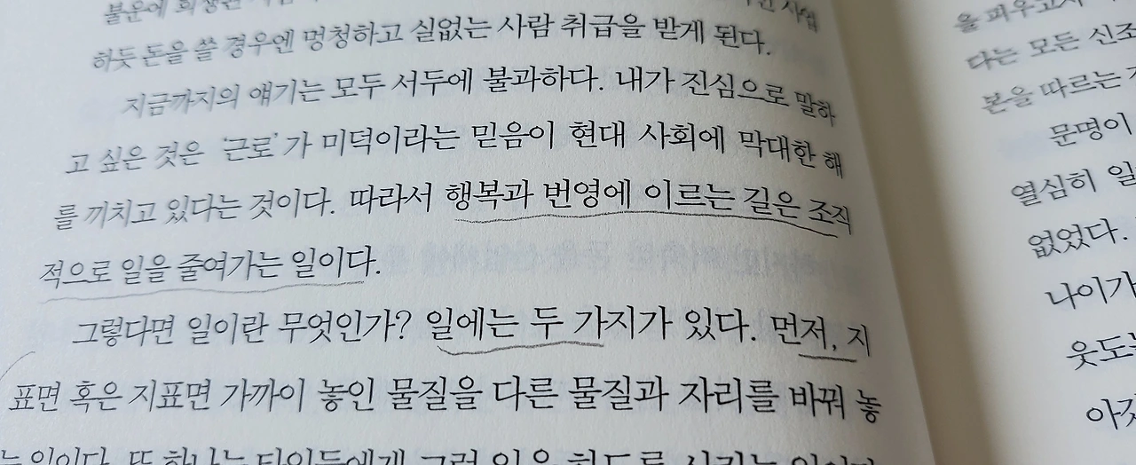 내가 진심으로 말하고 싶은 것은 '근로'가 미덕이라는 믿음이 현대 사회에 막대한 해를 끼치고 있다는 것이다. 따라서 행복과 번영에 이르는 길은 조직적으로 일을 줄여가는 것이다.