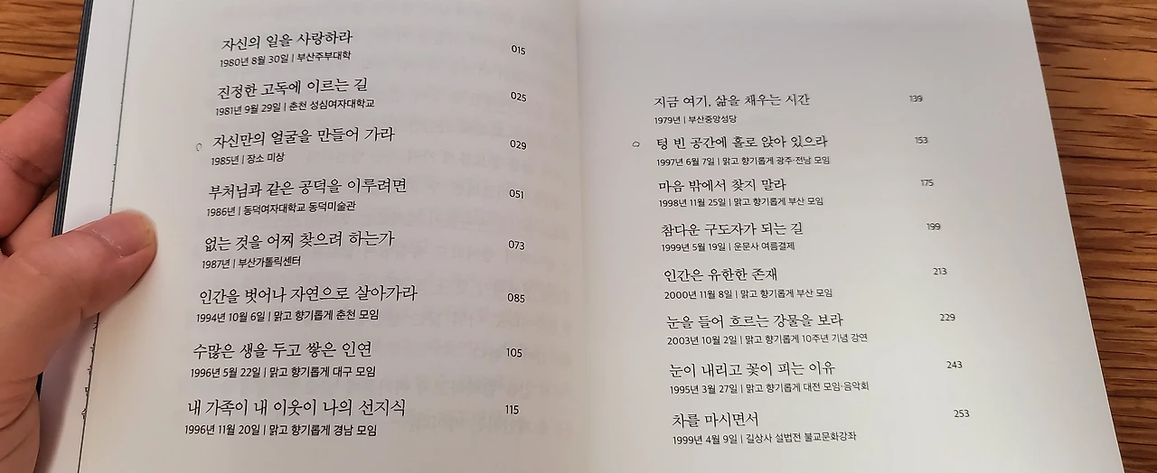 스님의 수필은 여백이 많은 '시'라면 이 책은 미공개 강연 채록집이라 그런지 지근거리에서 해타를 맞으며 육성으로 듣는 '수업' 같다. 군더더기 없이 차맛처럼 시간이 가도 은은한 스님의 수필은 여러 번 읽어도 다채롭다. 반면에 이 책은 강연의 특성상 중요한 말씀은 부언되고 강조할 만한 부분은 길어지기도 하는데, 읽고 나면 신기하게도 명약관화! 요지의 선명함이 뚜렷하니 무슨 아이러니인가 싶다.
