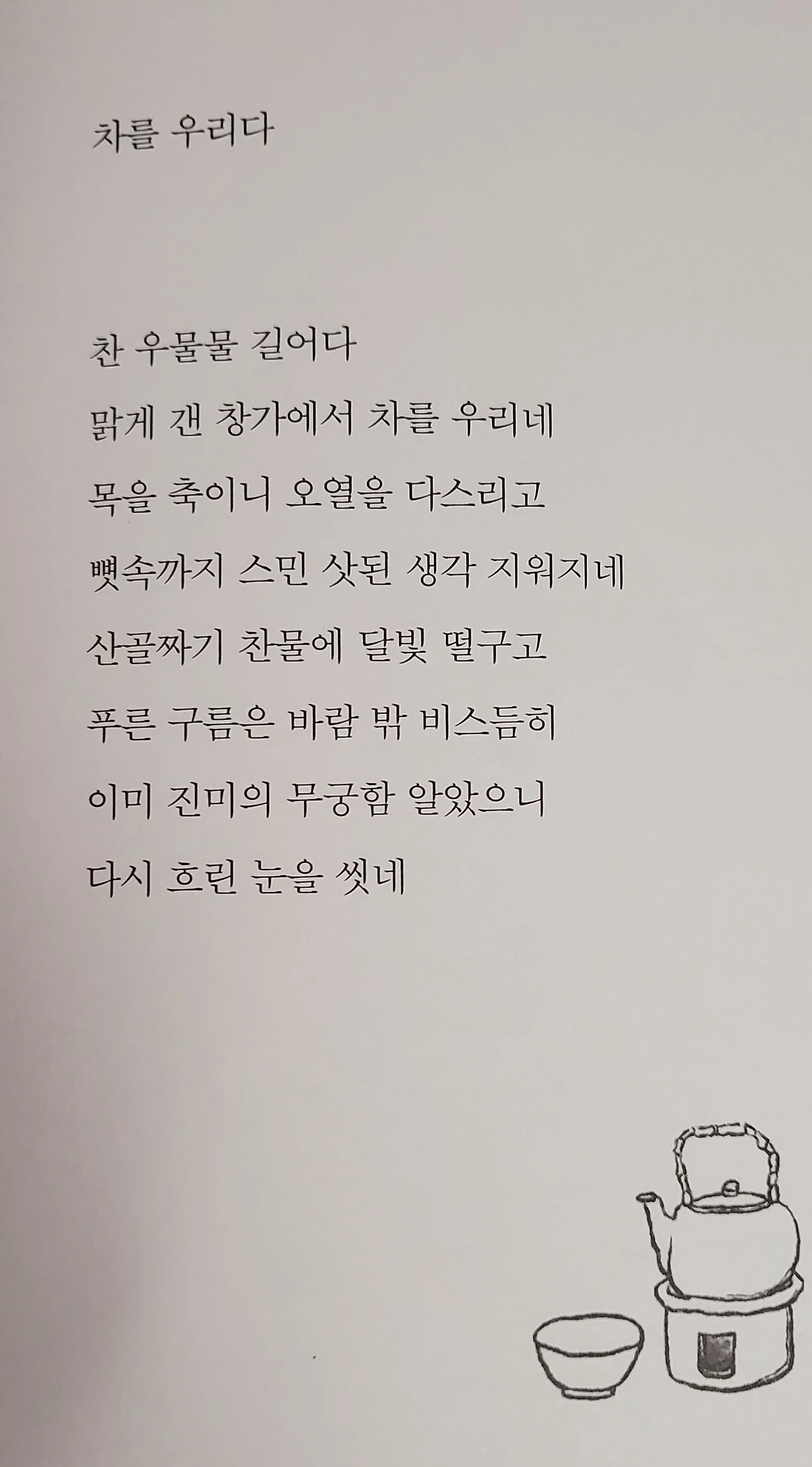 스님의 마지막 인사다. 희한도 하지. 정말로 스님께 차 한 잔 얻어 마신 듯한, 그래서 차 맛이 무궁하게 감도는 진한 고즈넉함이라니.