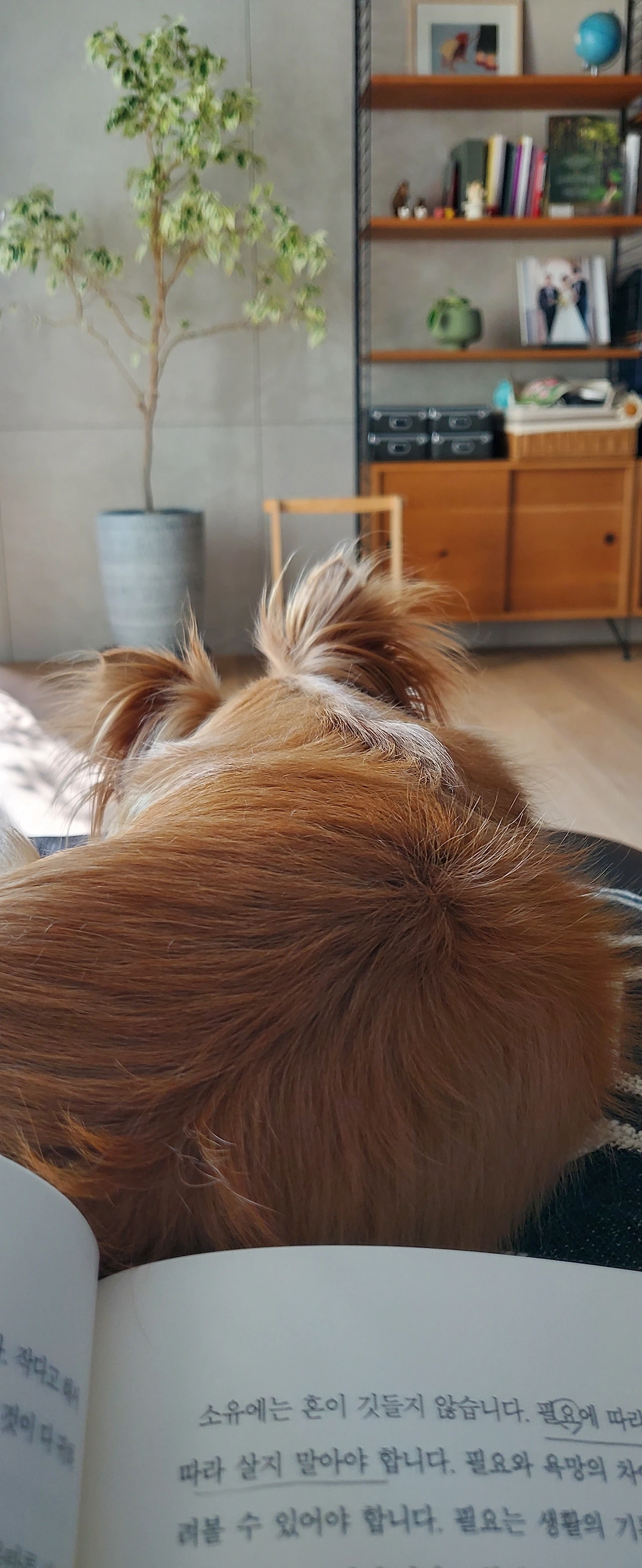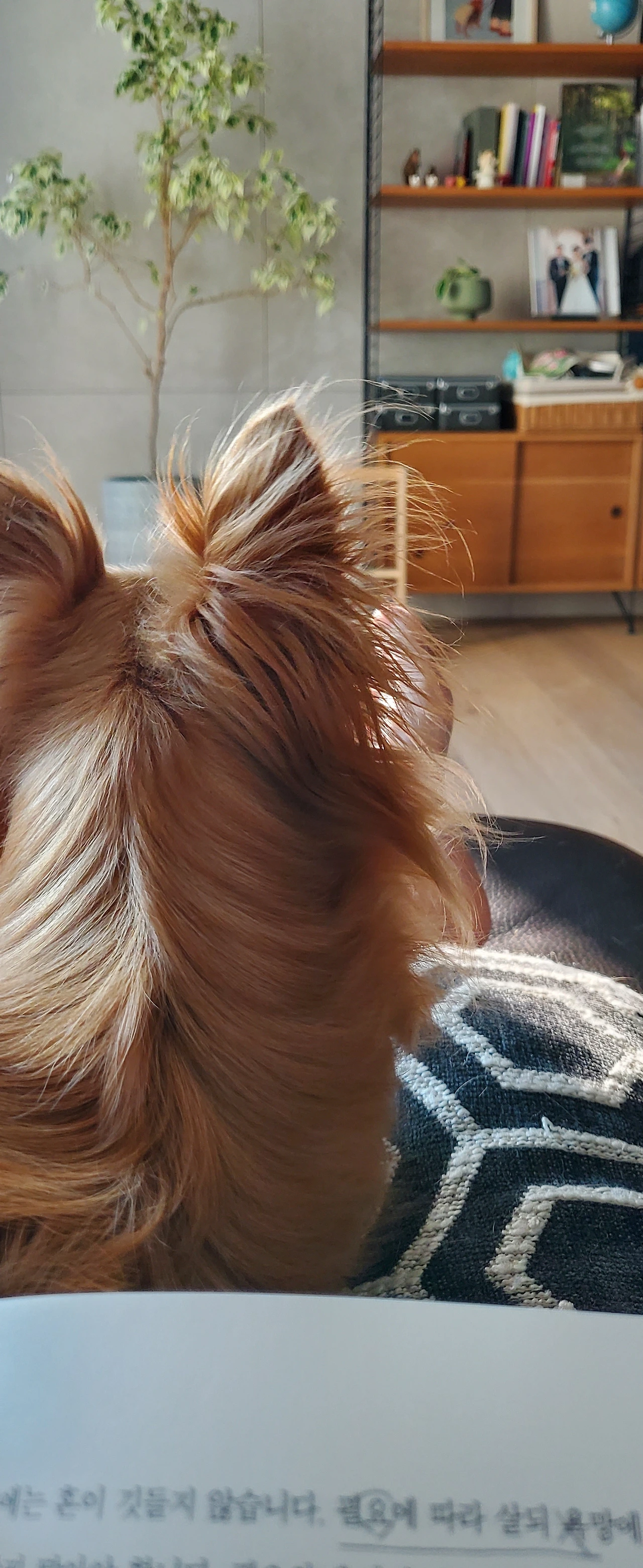 쿠션을 무릎에 얹고 내가 책을 보고 있으니, 이 위로 '척' 하고 올라와 저 뒤태로 '끙' 작은 콧김을 뿜고는 바로 잔다. 한참 지나면 다리가 저리지만 최대한 견딘다. 요 조그마한 존재의 따스한 무게는 늘 새삼스러워서 그 시간을 지연시키는 것이 마땅한 도리로 여겨지기 때문이다.
