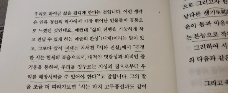 인간의 삶이 격상되고 아름다워지게 하는 '인간 정신의 상승 의지'가 창조적인 예술, 시를만들게 하고 즐기게 한다는 말이다. 그것을 통해 우리는 삶을 견디는 것이다.