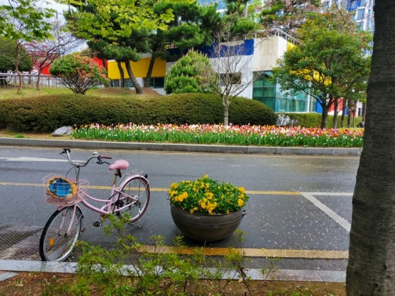 지하철에서 내리니 무슨... 그대의 자전거가 내게로 온다던 그 카피가 떡 하니. 저 건너 튤립은 또 뭔가. 이 쪽은 못 보았구나.