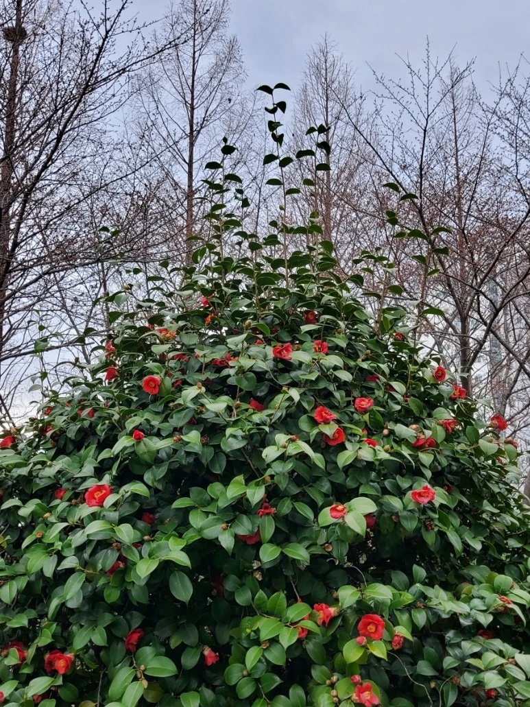 동백의 삐져나온 머리칼도 귀엽다. 시골 색시의 볼 같지, 저 붉은 미소는 항상.
