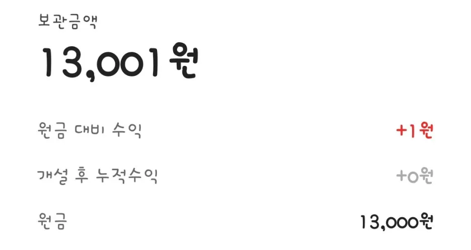 은행앱을 설치하고 뭔가를 했던 게 군 입대 이후여서 그때부터 기간을 계산했다. 23년 5월부터 누적된 금액들을 총 정산해서 이번에 MMF 박스로 모두 옮겼다. 중간에 공백기도 많아서 2년 동안 13,000원을 벌었다기보다는 어느 날 계좌를 보니 13,000원을 발견한 느낌?