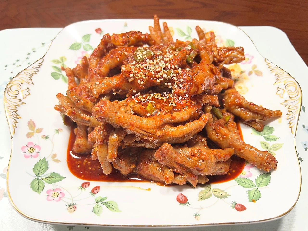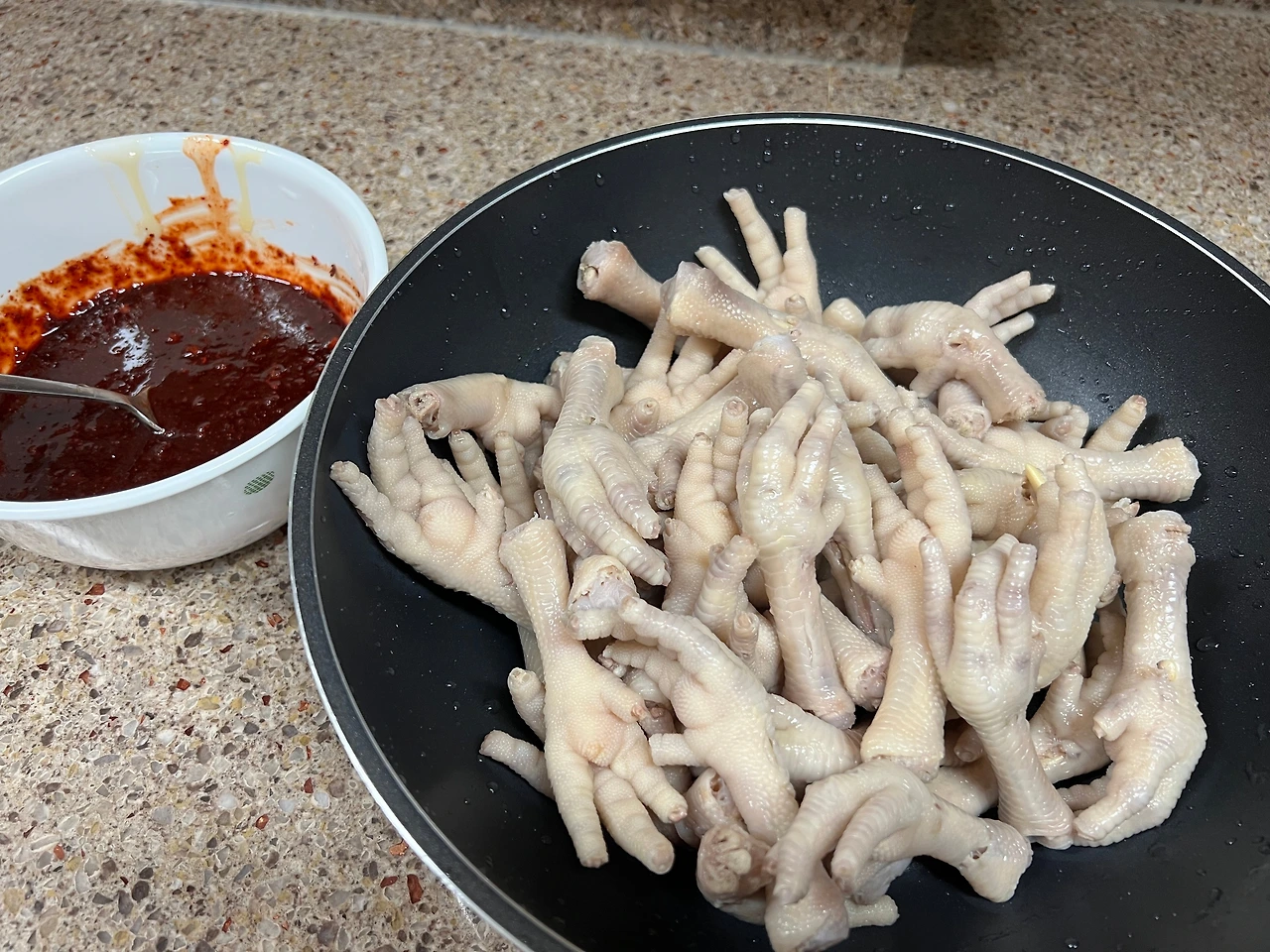 닭발을 깨끗이 손질해 씻은 뒤, 끓이기 전에 양념장을 먼저 만들어 둔다. 고추장과 고춧가루, 간장에 마늘을 넣고 단맛은 설탕 대신 쌀조청으로 낸다. 급하게 치고 올라오는 단맛이 아니라, 천천히 따라오는 맛이 좋다. 양념장은 잠시라도 두어야 맛이 가라앉는다.