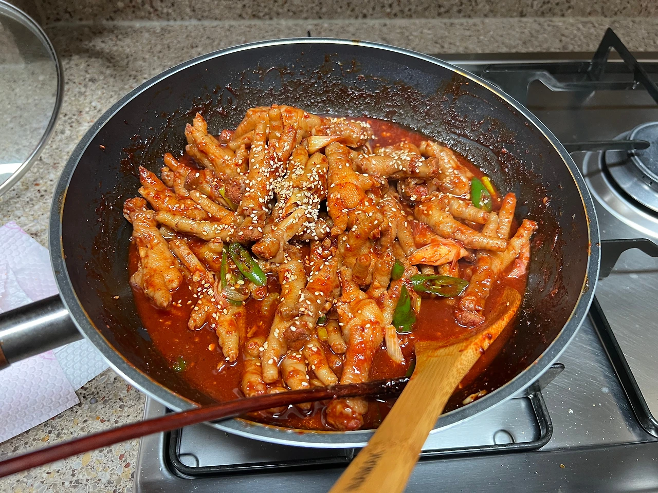닭발은 15분쯤 끓여 불순물을 걷어내며 익히고, 물에 깨끗이 씻어 양념장과 함께 다시 끓인다. 처음엔 불을 세게 두었다가 끓기 시작하면 줄인다. 뽀얀 색깔이 우러나면 국물에 힘이 생긴다. 콜라겐이 풀리면서 국물이 자작해지고, 숟가락으로 떠보면 묘하게 끈기가 느껴진다.
