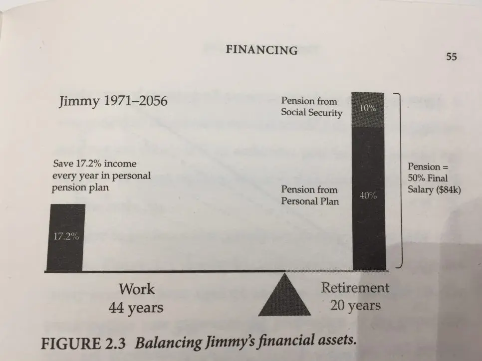 아빠 지미의 세대는 우리나라처럼 회사가 연금을 책임져 주지 않으므로, 국가연금을 제외한 나머지 연금을 본인 저축으로 마련해야 하니, 지미는 44년 근로 기간 동안 수입의 평균 17.2%를 저축해야 한다.
