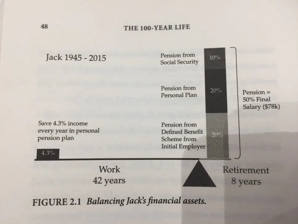 할아버지 잭의 경우 은퇴기간이 8년밖에 되지 않고, 과거 영국에서 회사가 연금을 책임졌으므로 본인이 마련해야 할 저축액이 은퇴기간 필요한 총연금의 40% 정도면 되므로, 이 금액은 42년 근로 기간 동안 매년 4.3%만 저축하면 마련할 수 있었다.