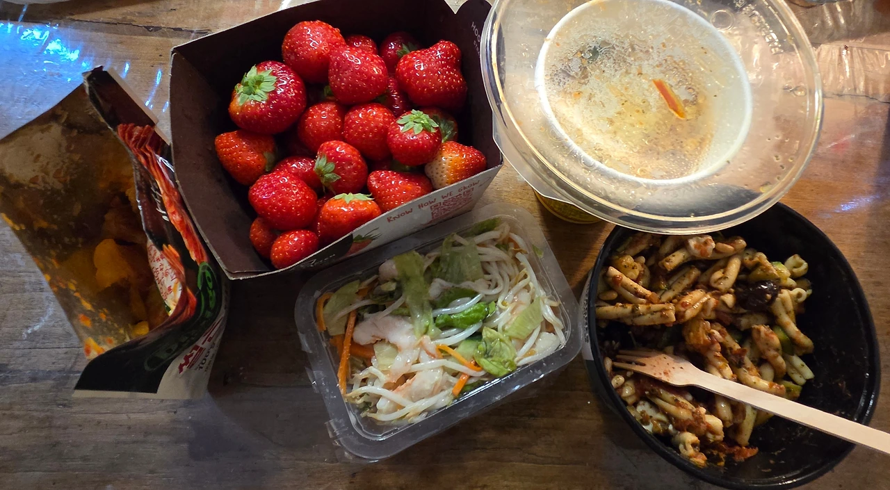 숙소로 돌아오며 새우가 들어간 샐러드와 딸기를 사 왔다. 딸기는 모양이 조금 달랐지만 맛은 비슷했다. 딸이 컵라면을 먹으라고 했다.
