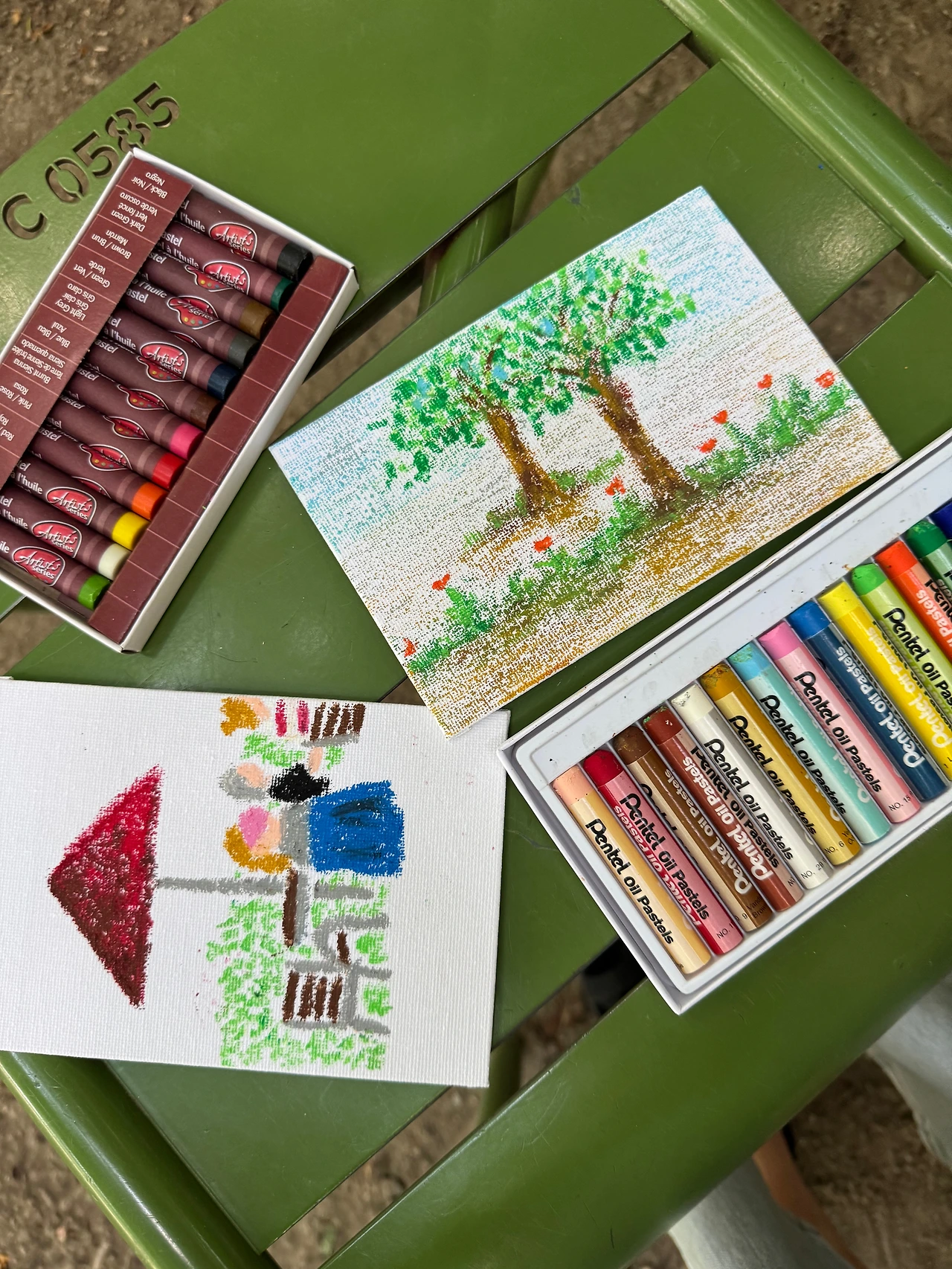 딸이 가져온 오일파스텔과 작은 캔버스에 그림을 그렸다. 싸게 산 오일 파스텔은 색이 제대로 나오지도 않는 불량이었다. 다른 건 선물 받은 거라 잘 나왔다. 몇 색 되지는 않았지만 되는 대로. 역시 누구 그림인지 딱 보면 알겠다. 숙소에 와서 내가 가져온 걸로 덧칠을 하자고 했지만 우린 곯아떨어졌다.