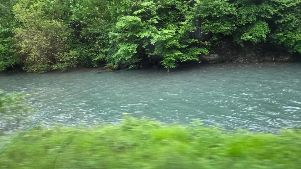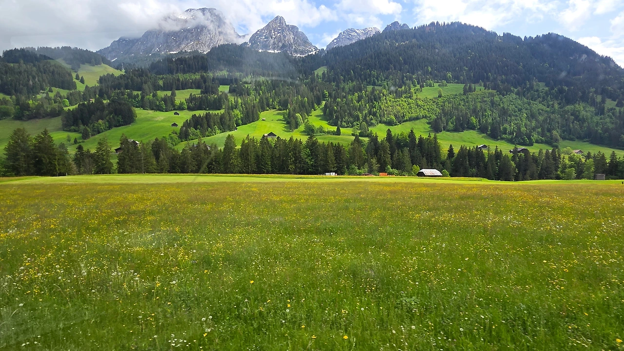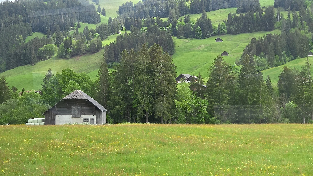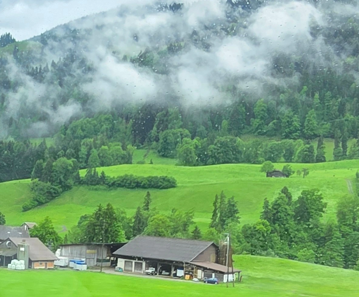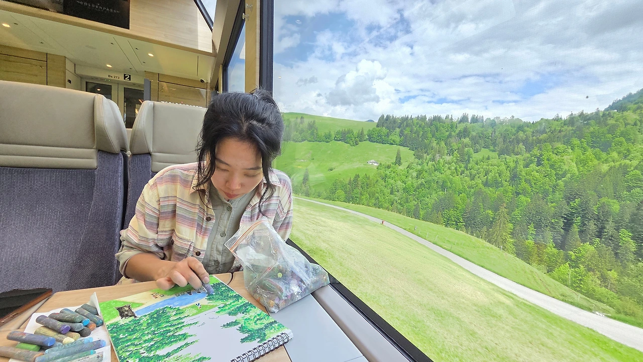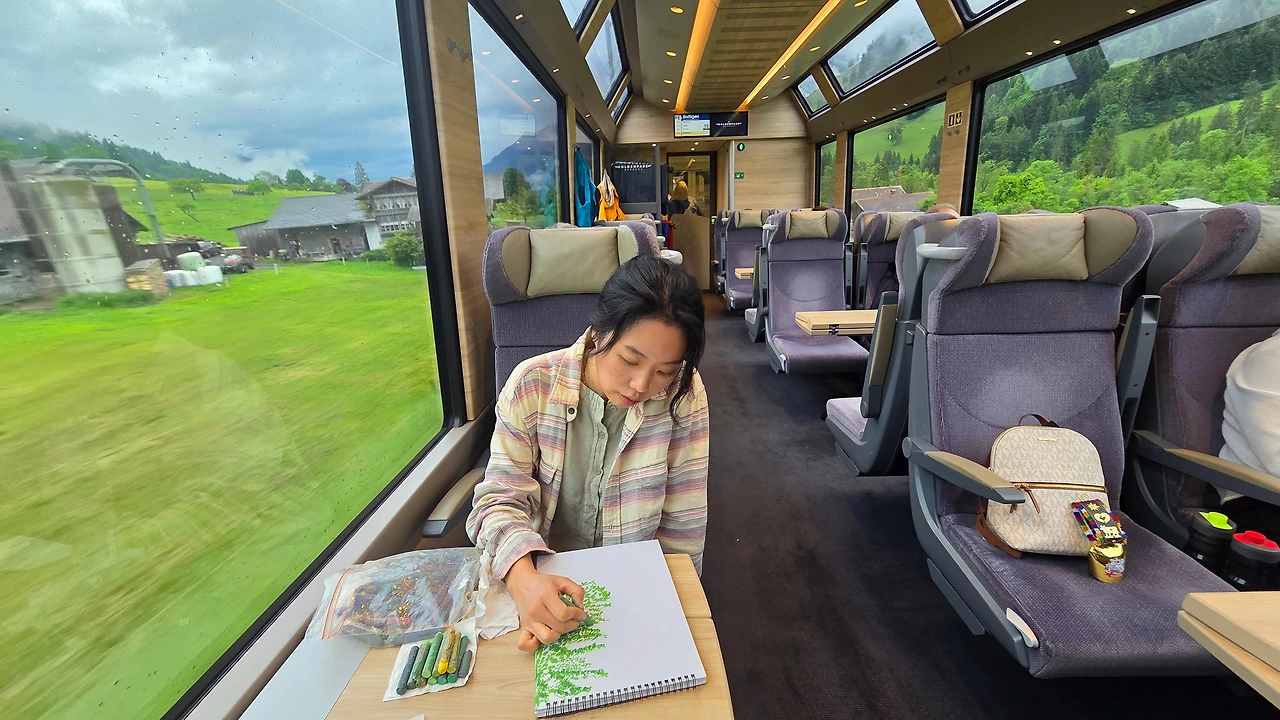 스위스 풍경은 차원이 다르네. 여기가 바로 '지상 낙원'이다. 높은 산에도 집을 짓고 살다니 대단하다. 자세를 아예 창문 쪽으로 틀어서 앉았다. 내 눈동자가 초록색으로 변할 것 같다. 이쪽을 보면 반대쪽 창문 풍경이 예뻐서 고개를 좌우로 돌려가며 봤다. 특별히 좋은 풍경이 나오면 사람들이 아예 서서 찍었다.