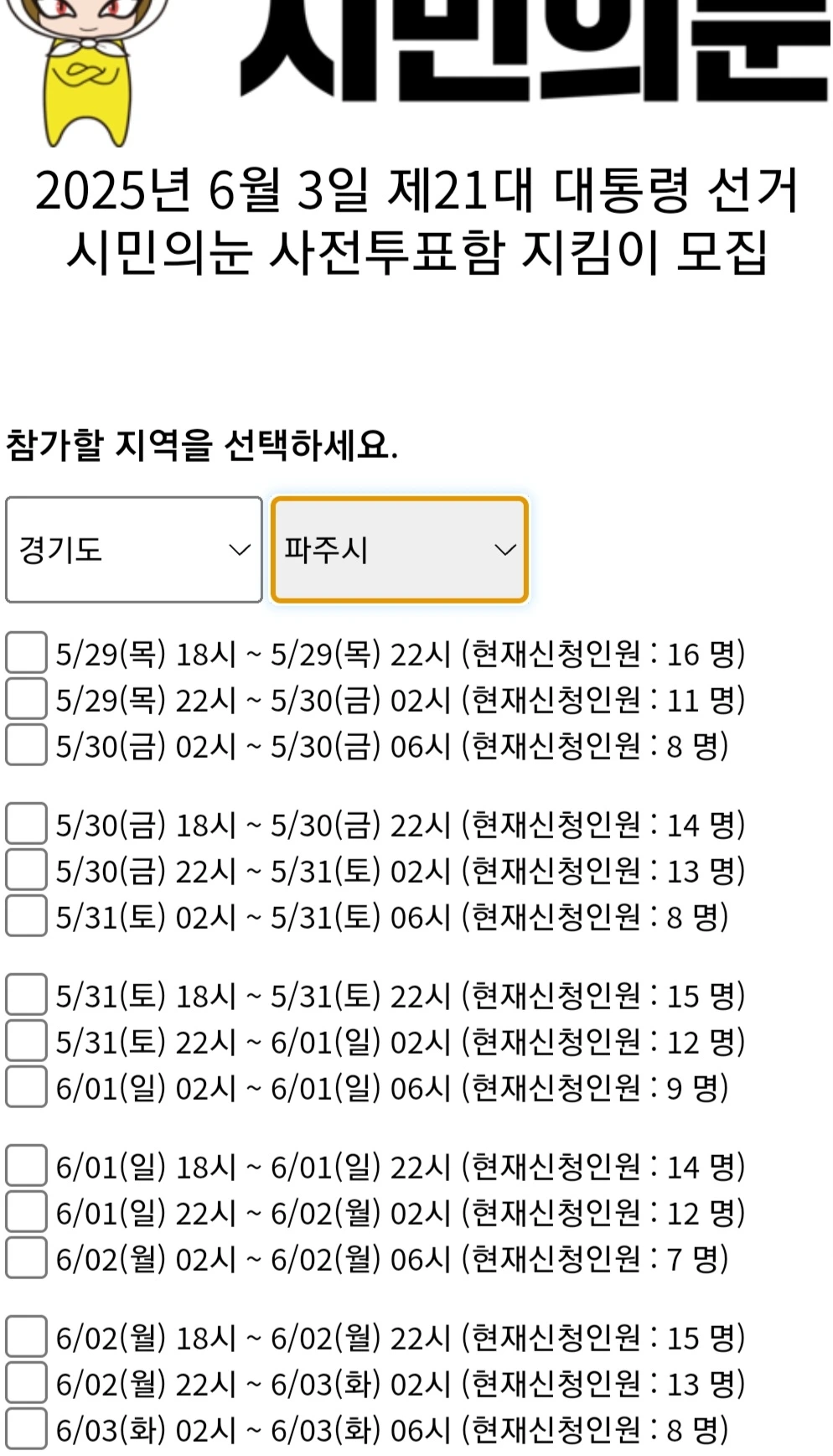 집회도 언니 따라 몇 차례 갔지만 언니만큼 순수한 마음은 아니다. 이번에도 가긴 했지만 역시나 매번 같은 마음으로 갔다. 언니 혼자 보다는 함께가 낫지 않을까. 언니는 신청자가 가장 적은 6월 2일 월요일 새벽 2시에서 6시까지로 선택했다. YY