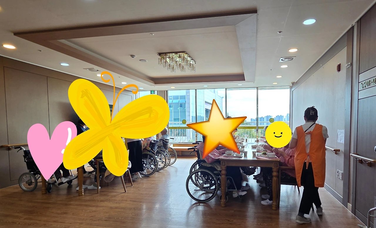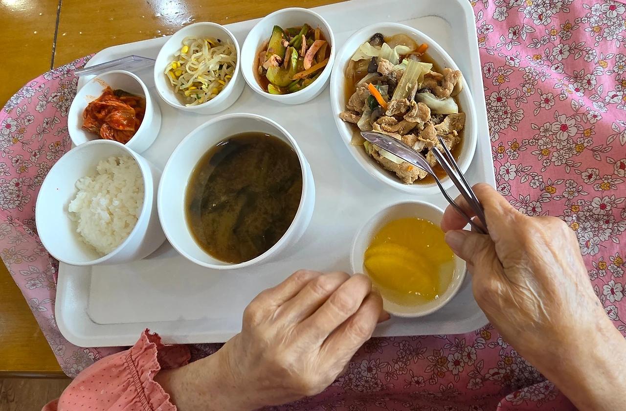엘리베이터 문이 열리고 밥차가 올라왔다. 요양보호사들이 분주해졌다. 어르신 성함을 확인하며 식판을 갖다 드리고 식사 보조가 시작됐다. 드시기 쉽게 반찬을 식가위로 잘라드렸다.