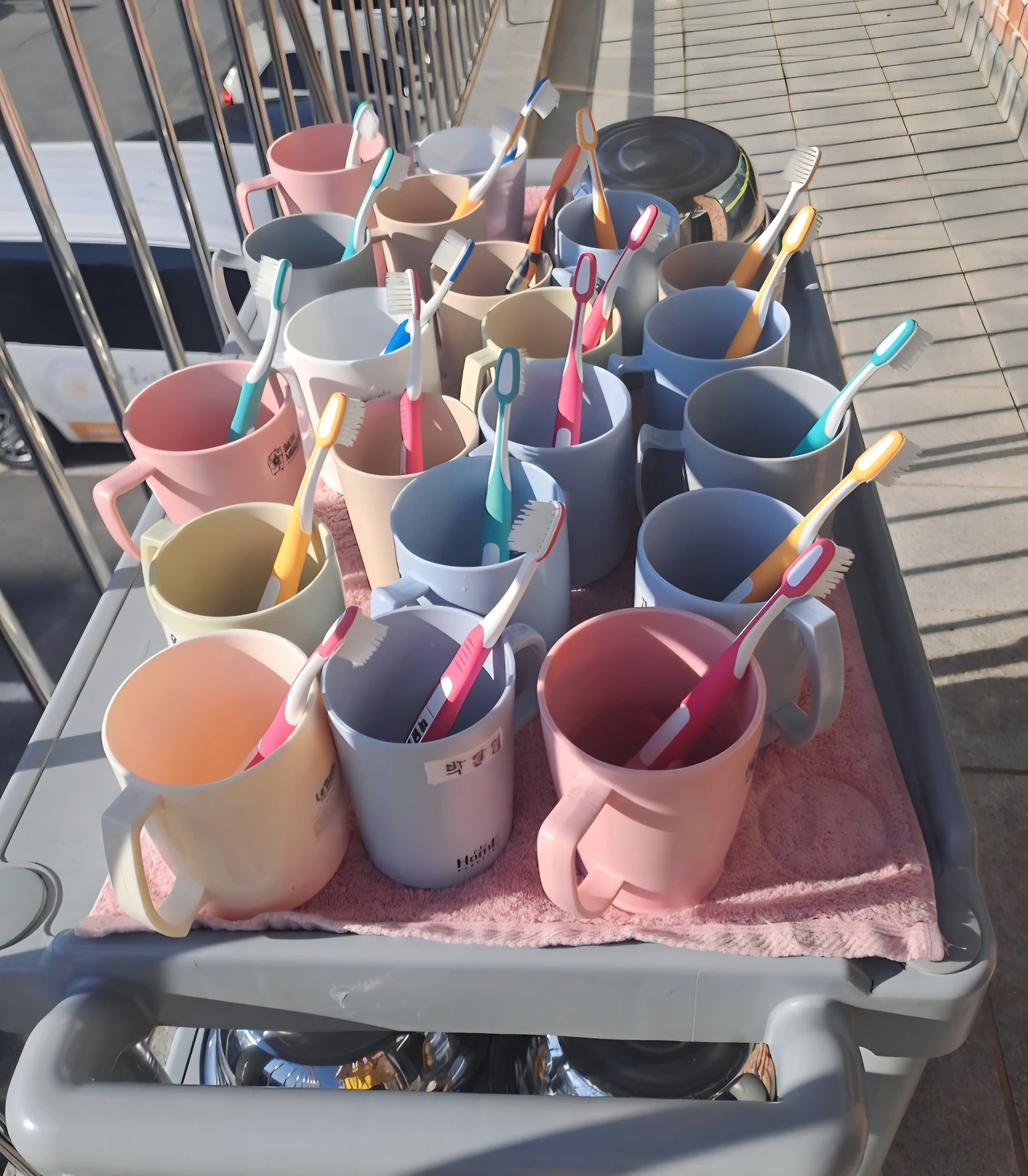 바람과 햇볕을 받고 있는 어르신들의 알록달록한 칫솔과 양치컵까지 사랑스럽다.
