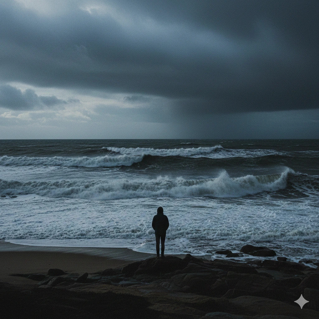 어둡고 커다란 파도와 그 파도에 맞닿을 듯 내려앉은 검은 구름 사이에서,