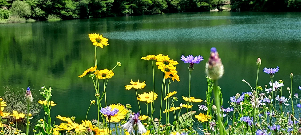 숲속 저수지 둑에는