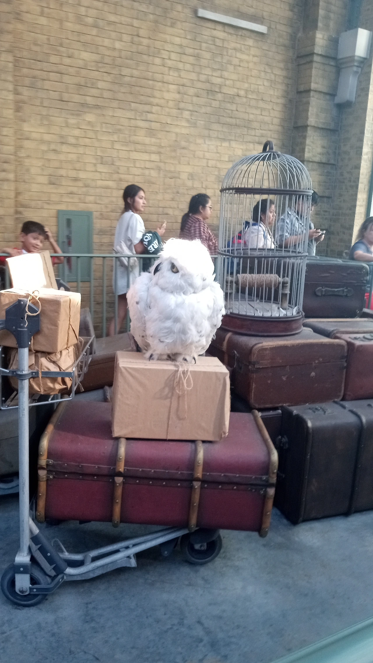 목이 거의 360도 돌아가는 흰 올빼미 헤드위그 인형이 하라는 우편물 배달은 안 하고 승객들을 빤히 쳐다보고