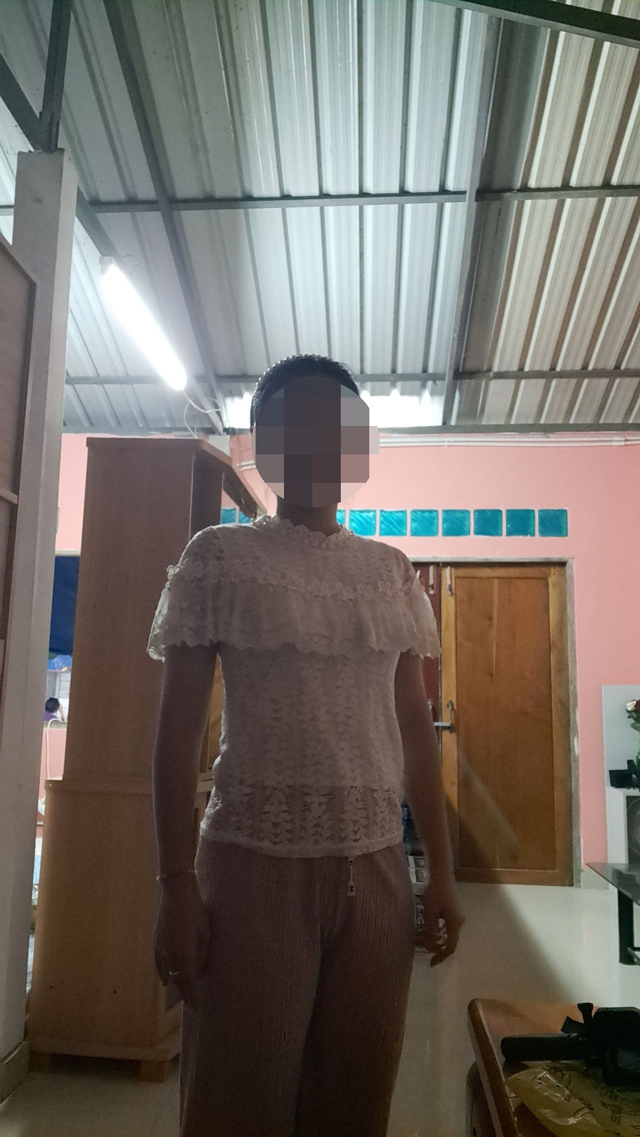 엄언니는 오랜만에 고향에 와서 그런지 에너지가 넘쳤다. 언니는 집 앞에 있는 슈퍼마켓에서 오토바이를 빌리더니 나와 친구를 테우고 붉은 흙 길을 달렸다. 어느 골목에는 개가 나타나 돌을 던지다느니 막대기를 구해 휘두르냐느니 하는 일도 있었다. 그렇게 동네 구경을 마치고 손님 맞을 준비를 마친 마당에서 저녁을 먹었다. 한쪽 재단에는 불교 용품으로 보이는 것들이 차례로 놓여 있었고 벽에는 조카사진이 들어간 플랜카드가 붙여있었다. 가족들은 노래방기계 앞에 모여 돌아가며 태국 가요를 불렀다. 나는 엄언니 어머니 집 한쪽 구석에 앉아 쉬고 있는데, 언니가 여러 장신구와 레이스 달린 옷들을 꺼내왔다. 그리고 내게 입어보라고 권했다.