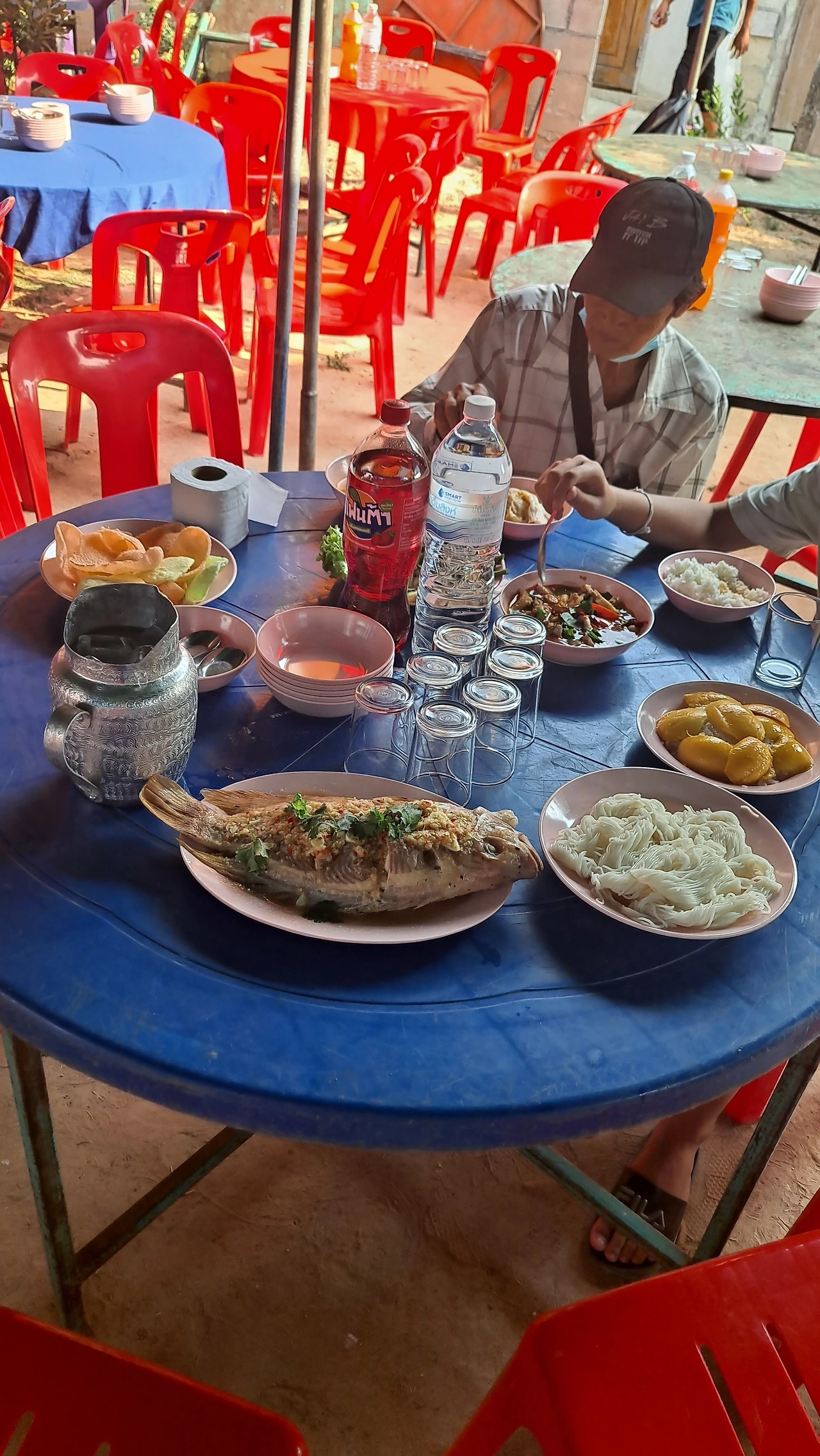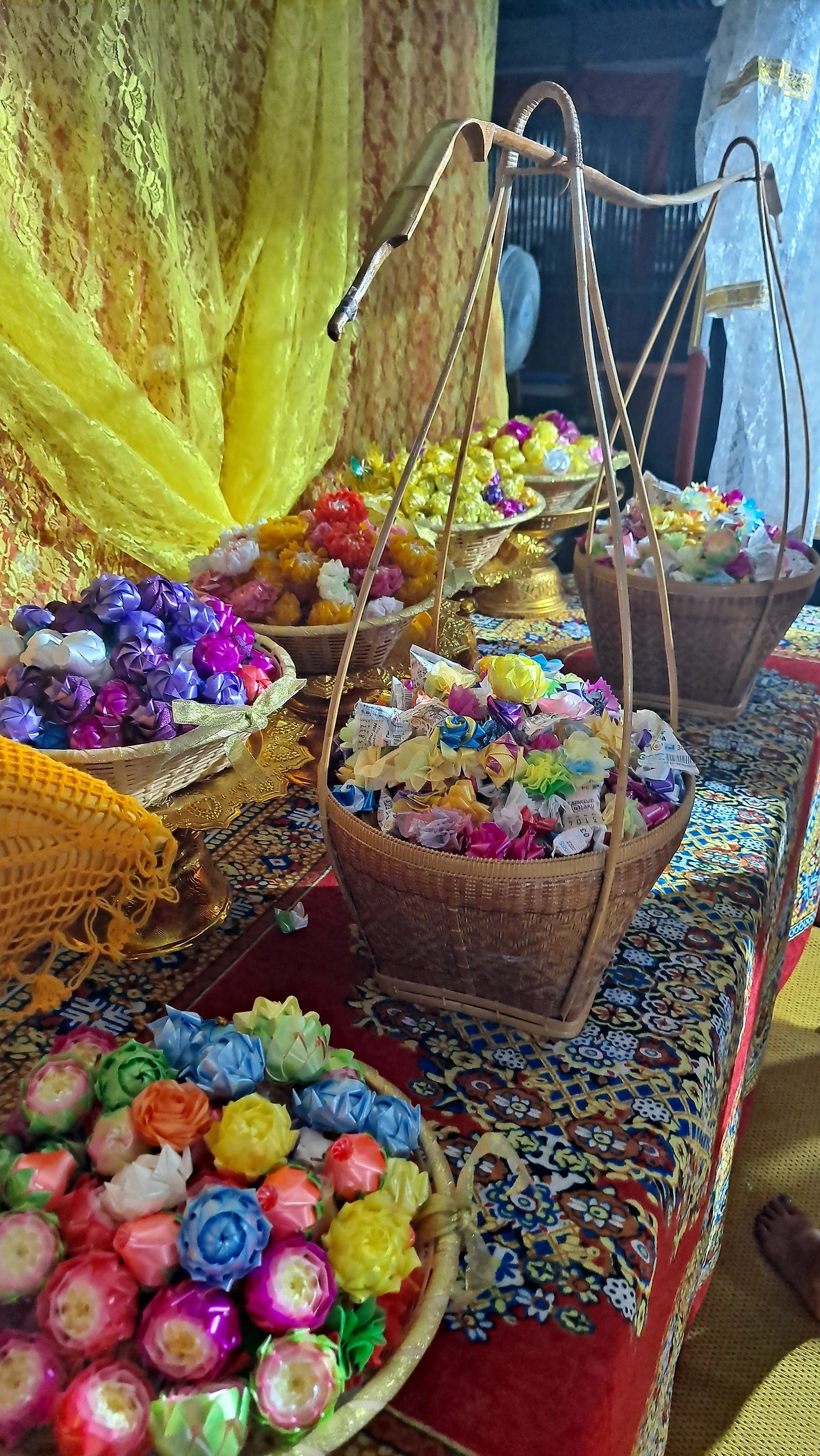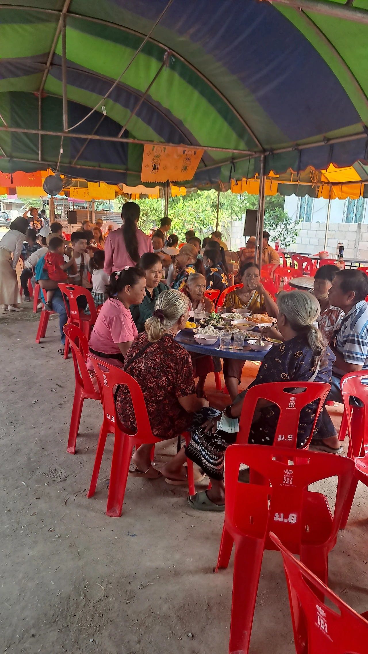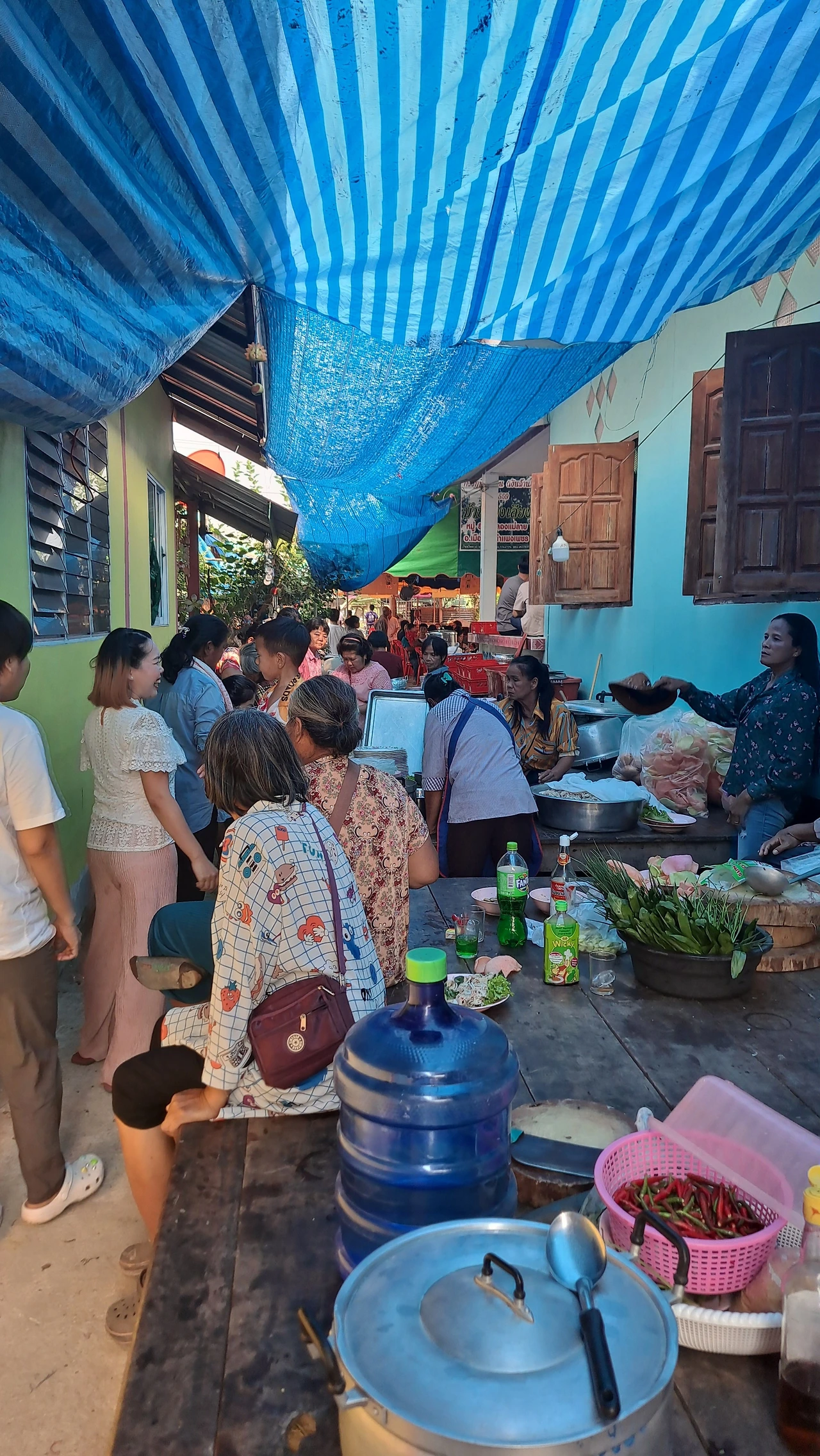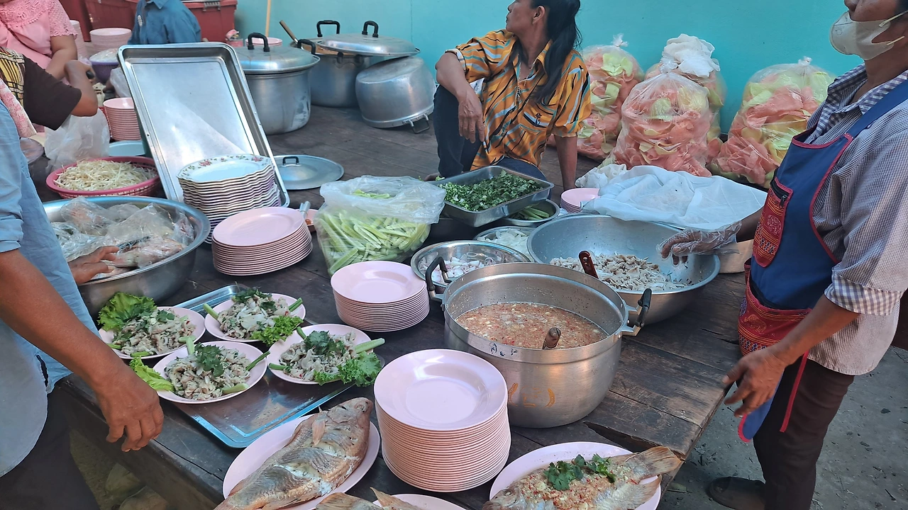 나는 반 강제로 언니와 같이 분홍색 바지에 레이스 달린 상의를 맞췄다. 그리고 반짝이 핀으로 말갈족 같은 머리를 뒤로 올렸다. 차마 혼자보기가 아까운 모습에 가족과 영상통화를 걸었는데 내 모습을 본 모두가 웃겨 뒤로 넘어갔다. 엄마는 자신의 딸이 맞는지 의심스럽다고 까지 했다. 나는 아는 사람도 없으니 창피할 것도 없었다. 밤은 깊어갔고 한낮의 더위도 식어갔다. 노래방 소리도 끊기고 다들 잠에 든 것 같았다. 그러기도 잠시. 여자들은 새벽 한 두 시부터 음식을 준비하는 듯싶었고 다섯 시쯤 되니 대형 스피커에서 신나는 음악이 울려 퍼졌다. 그 소리가 얼마나 컸냐면 집안이 둥둥 울릴 정도였다. 나는 그 소리를 이기고 아침 여덟 시까지 잠을 잤다. 시끌벅적한 소리는 시간이 갈수록 더해졌고 낯선 낌새에 일어나 밖으로 나갔다. 처음 그 광경을 목격한 나는 잠시 꿈인가 싶었다. 마당엔 동네 사람들이 가득 들어차 있었고 주방이 분주히 돌아가고 있었다. 테이블에 자리를 잡고 앉으니 팔뚝 만한 생선을 비롯해 각종 잔치 음식이 올려져 있었다. 어쩌면 내가 생각한 것보다 실로 더 성대하고 화려한 탁발식이 될 것 같았다.