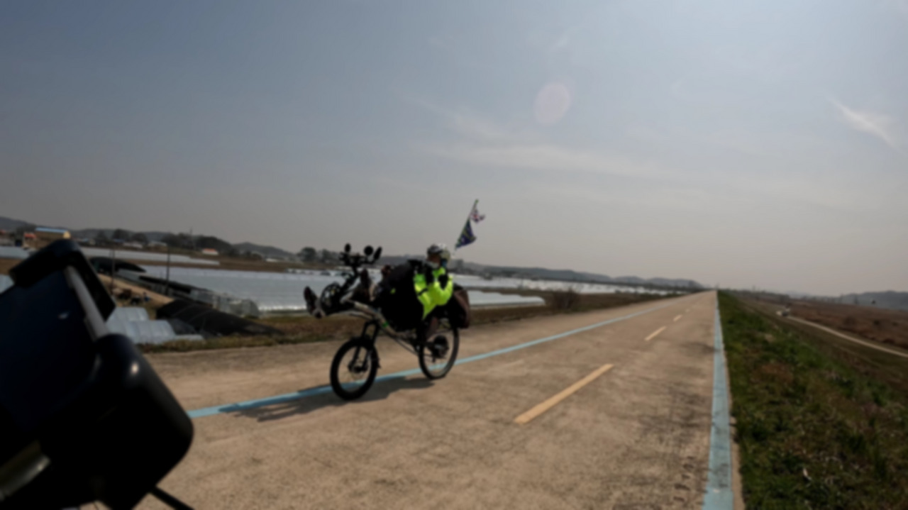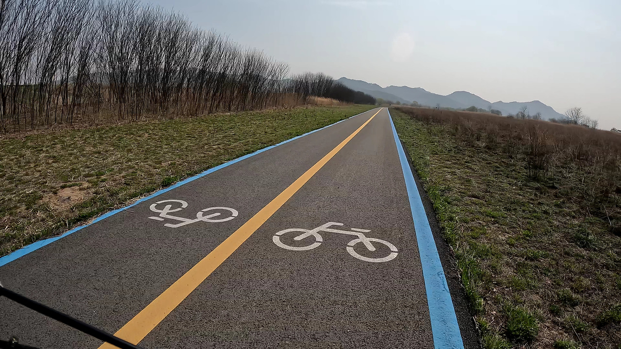 걸어서 언덕을 오르는 중산을 넘자 벚꽃길이 계속되었다. 이제는 종주를 하는 사람들이 아니라 단지 벚꽃을 보러 자전거를 끌고 나온 사람들도 보이고 연인끼리 풀밭에 앉아 피크닉을 즐기는 모습도 보였다. 달릴수록 벚꽃이 만개한 강가에서 주말을 즐기려는 사람들이 늘어남과 동시에 바람이 불기 시작했다. 바람의 저항을 많이 받아서인지 자전거의 속도는 점점 더 줄어들었다. 입고 있는 바람막이가 쉴 새 없이 펄럭이고 도로를 질서 없이 걸어 다니는 행인들을 피하느라 정신이 없었다. 어느 순간에는 갑자기 뛰어드는 아이와 부딪힐 뻔하기도 했다.