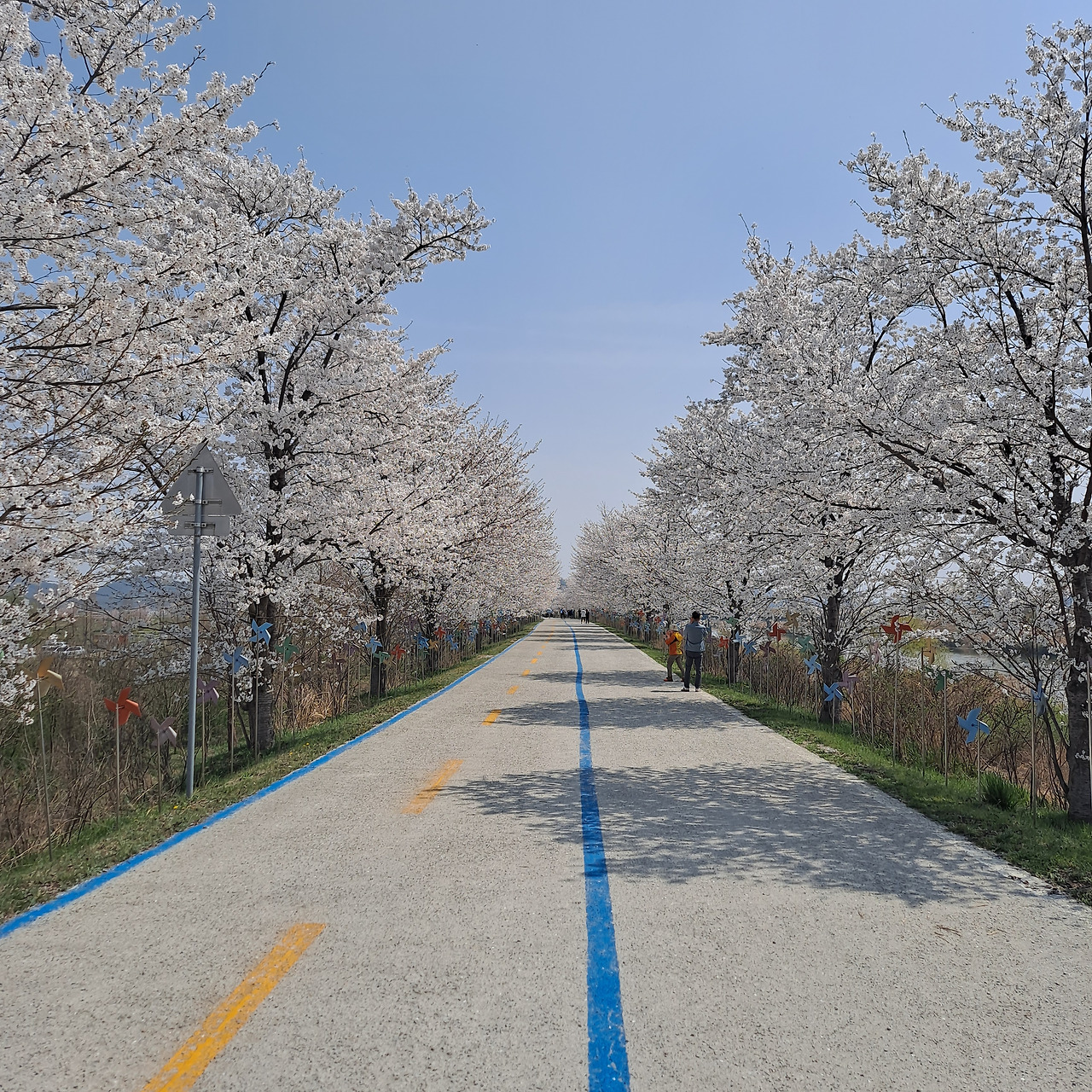 길에 들어서자 나는 마치 깜짝 이벤트를 받은 사람처럼 벙벙한 표정을 지을 수밖에 없었다. 눈이 소복이 내려앉은 것 만 같은 벚꽃나무가 길 양쪽으로 빽빽이 늘어서 눈꽃잎을 흩날리고 있었다. 조급하던 내 페달은 점점 느려져 결국 멈추었고, 풍경을 천천히 눈에 담고 싶은 마음에 내려걸었다. 오면서 질리도록 보았던 바람개비들이 나무사이로 고개를 내밀고 있는데, 벚꽃과 함께 있으니 이 또한 아름다운 장면의 한 조각이 되었다.
