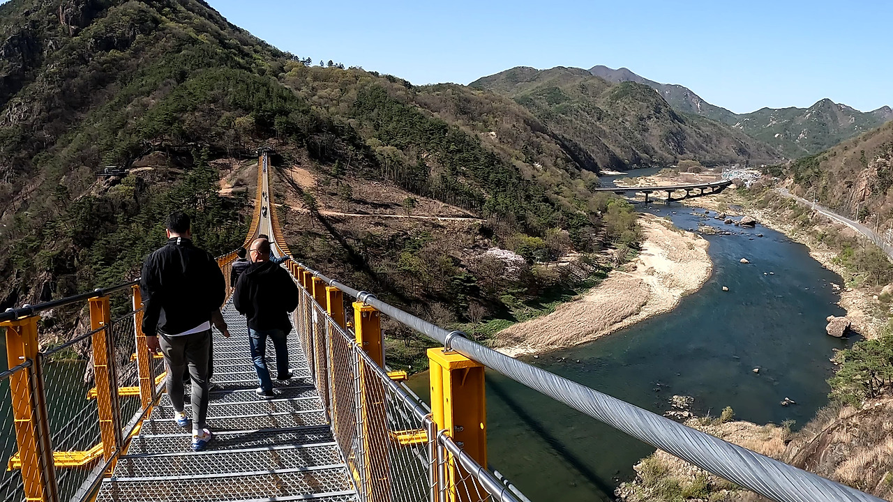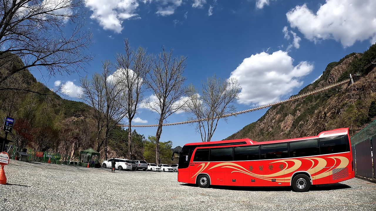 잠깐 잠이 들었을 때 차는 출렁다리 근처 주차장에 멈추었다. 그리 오래 거리지도 않았는데도 없는 승차감에 목이니 등이니 찌뿌둥했다. 구겨진 인상과 몸을 한데 펴가며 차에서 내려보니 멀리서 말로만 듣던 출렁다리가 보였다. 그 모습이 거대한 두산 사이를 실오라기 같이 이어주고 있는 것 같았다.