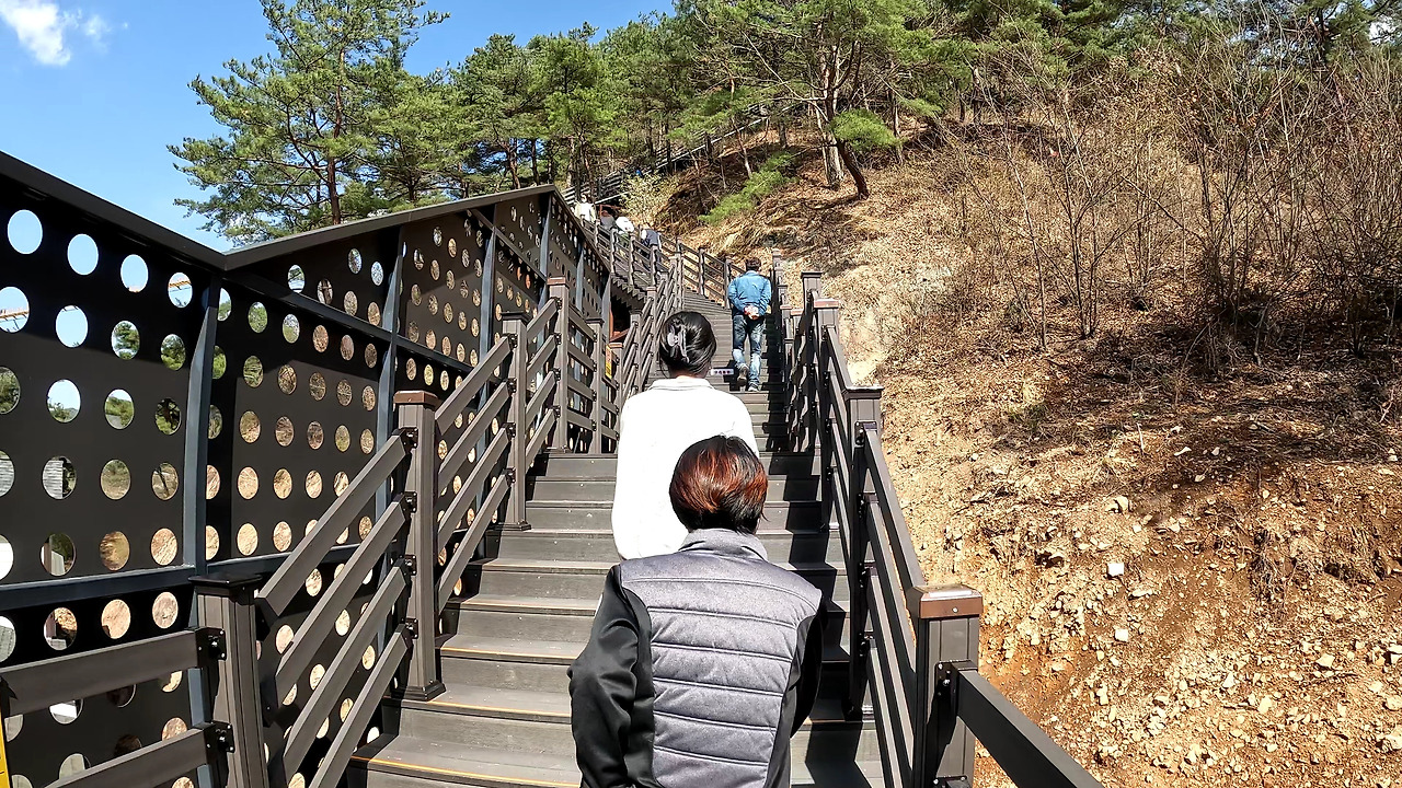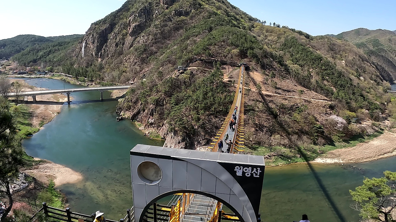 출렁다리 입구에 들어서자 등산이 예고되는 계단이 시작되었다. 운동은 좋은 것이지만 계속되는 계단에 숨이 찰 수록 아무 생각 없이 무작정 따라나선 걸 후회하기도 했다. 우린 먼저 출렁다리를 건너지 않고 전망대에부터 올랐다. 목적지에 이르렀을 때 저질 체력인 둘째 동생은 밴치에 널브러졌고, 막내는 제일 어려서 그런지 여전히 펄펄 날아다녔다. 전망대 펜스에 가까이 다가가 보니 강을 끼고 이어진 다리에 많은 사람들이 오가고 있는 모습이 보였다.