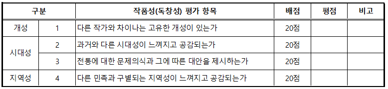 아래와 같이 작품의 독창성 평가표를 만들어 본다. 참고로 평가 항목에는 기법과 기교에 대한 배점이 빠져 있다. 형식보다 개념을 중시하는 현대미술의 특성이 평가표에 주요하게 반영되었기 때문이다.