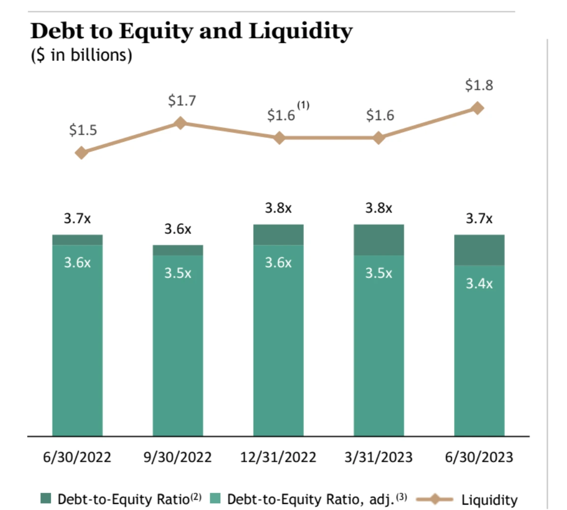 그렇다면 BXMT는 8% 이자를 받는데, 어떻게 투자자들에게는 10% 이상의 배당을 줄 수 있을까? 바로 레버리지이다. 약 3배가량의 레버리지를 사용하고 있는데, 즉 BXMT가 3,000만 원짜리 대출은 한다고 가정한다면 1,000만 원은 BXMT 주주가 투자한 돈이고, 나머지 2,000만 원은 채권 시장에도 조달한 대출금으로 대출을 해준다. 즉 2,000만 원 대출을 받아서 다시 대출을 해주는 셈이다.