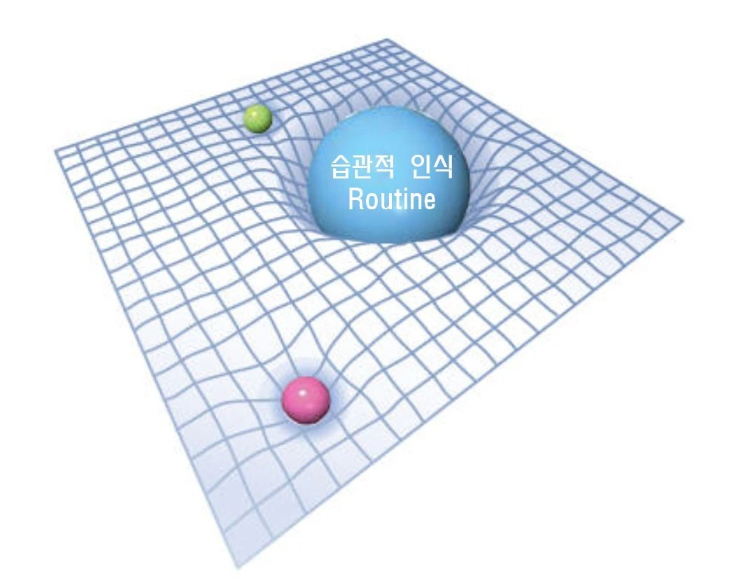 그림 1/ 먼저 '고정관념'이 인식의 편향과 왜곡을 가져온다는 사실을 이해할 필요가 있다. 아래 그림은 본래 '중력'이 시공간을 왜곡시키는 모습을 개념화한 것이지만, 고정관념이 인식의 근본 바탕을 왜곡시키는 것도 같은 모습이라 하겠다. 이것은 '생각의 함정 trap'이라고 할 수가 있다.