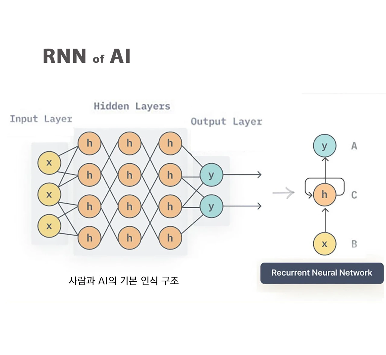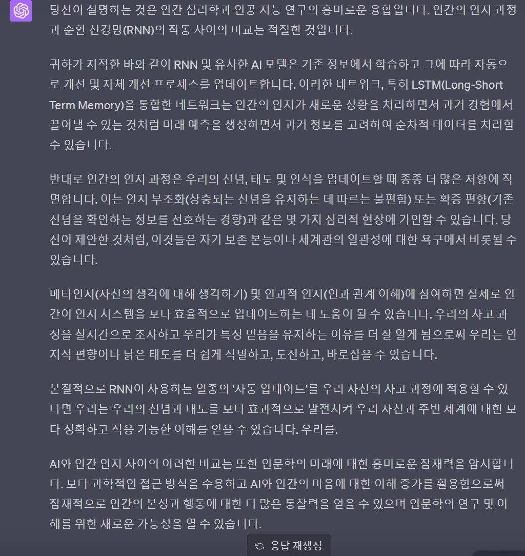 순환 신경망 RNN 인공지능은 순환 신경망 RNN를 통해 기존 정보를 활용하고 ‘자동 업데이트’하는 방법으로 학습한다. 인간의 경우엔 ‘자동 업데이트’가 쉽지 않다. 우리는 현재의 자기 인식체계를 유지하려는 성향이 크기 때문이다. 이것은 애써 마련한 현재의 자기 인식체계를 깨지 않으려는 자기 보호 본능일 수도 있다. 이 문제의 해법은 앞서 말한 ‘메타인지 meta cognition’와 ‘원리적 앎 causal cognition’을 계획적으로 수행하는 것이다. 이를 통해 실시간으로 자기의 인식 과정을 관찰해 자신의 ‘인식체계’를 최신의 것으로 갱신하는 습관을 가지는 일이다. 이러한 기능은 우리의 인식 과정에 이미 있지만 우리는 이것을 깨닫지 못하고 그 중요성을 깊이 알지 못한다.