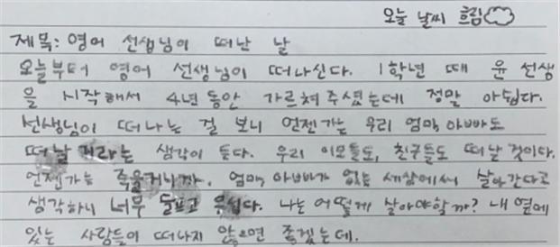 모든 열두 살들이 저 말을 몸서리치게 두려워하는지 모르겠으나 위에 있는 일기를 쓴 열두 살은 그랬다. 그날 차가운 책상에 앉아 연필을 든 오른손으로 ‘떠날 거라는’, ‘죽을 거니까’, ‘슬프고 무섭다’라는 단어를 꾹꾹 눌러썼다. 그리고 허공을 잡은 왼손으로는 눈을 꽉꽉 눌렀다. 종이가 더 이상 쪼그라들지 않도록 말이다. 일기를 검사하는 담임선생님께 번진 글자를 들키고 싶지 않았다.