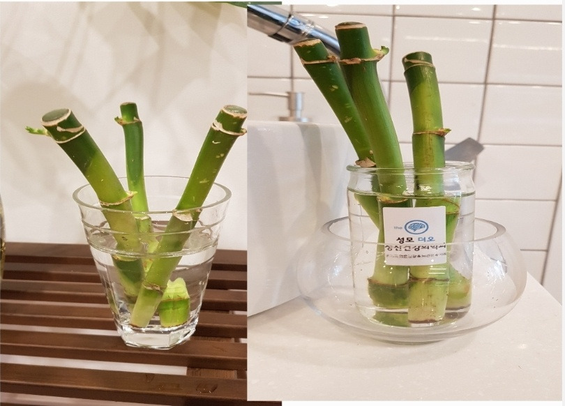 "행운목을 키우면 좋은 운이 온다"는 이야기를 어디선가 들었던 기억이 났고, 당시 3천 원이라는 저렴한 가격에 충동적으로 구입했습니다. '별 기대는 하지 말자. 그저 진료실의 무료함이나 달래보자' 하는 마음으로 작은 물컵에 담아 사진을 찍어두었던 기억이 납니다. 사진을 보면 아시겠지만, 잎 하나 없이 앙상한 줄기 세 개가 정말 썰렁하기 그지없었죠.