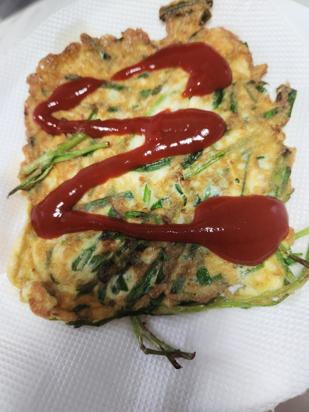 직접 만든 따뜻한 부추계란전. 브런치에 올리고 싶어 먹기 전에 사진 찍었다.