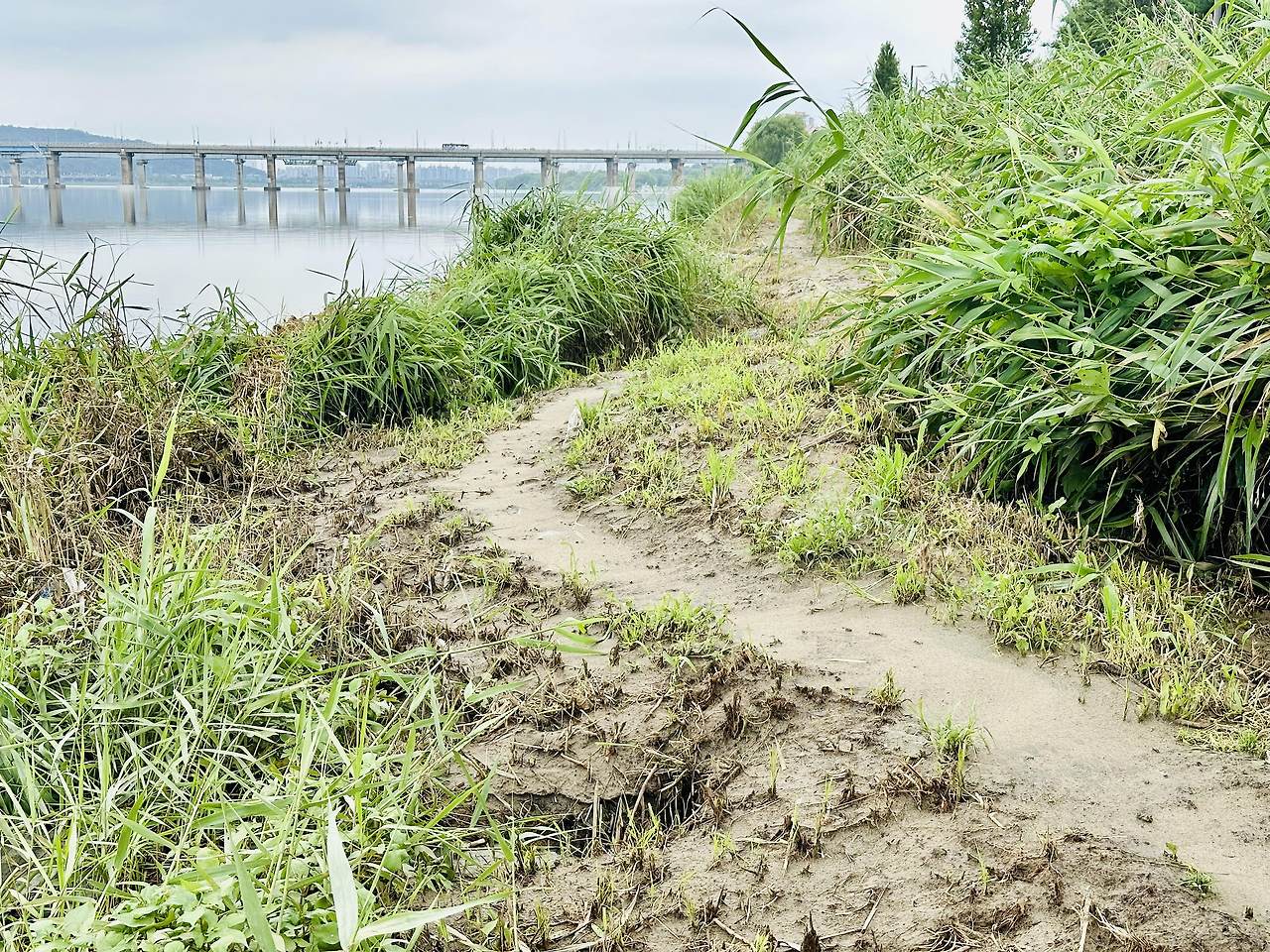 그 구불길은 물과 더 가까울 뿐만 아니라, 끝도 없이 늘어선 버드나무를 계속 마주할 수 있어서 고맙고 고맙다. 그 고마움을 찰나적으로 깨뜨리는 제4의 길이 있다. 한층 더 물 가까이 이끄는 길 아닌 길, 다름 아닌 낚시꾼 길이다. 보행 아닌 탐색 목적으로 걸은 발걸음이 쌓여 제법 도타운 흔적을 만들어낸 것이다. 길이 갈 수 없어서 이런 길은 아연 신비롭다.