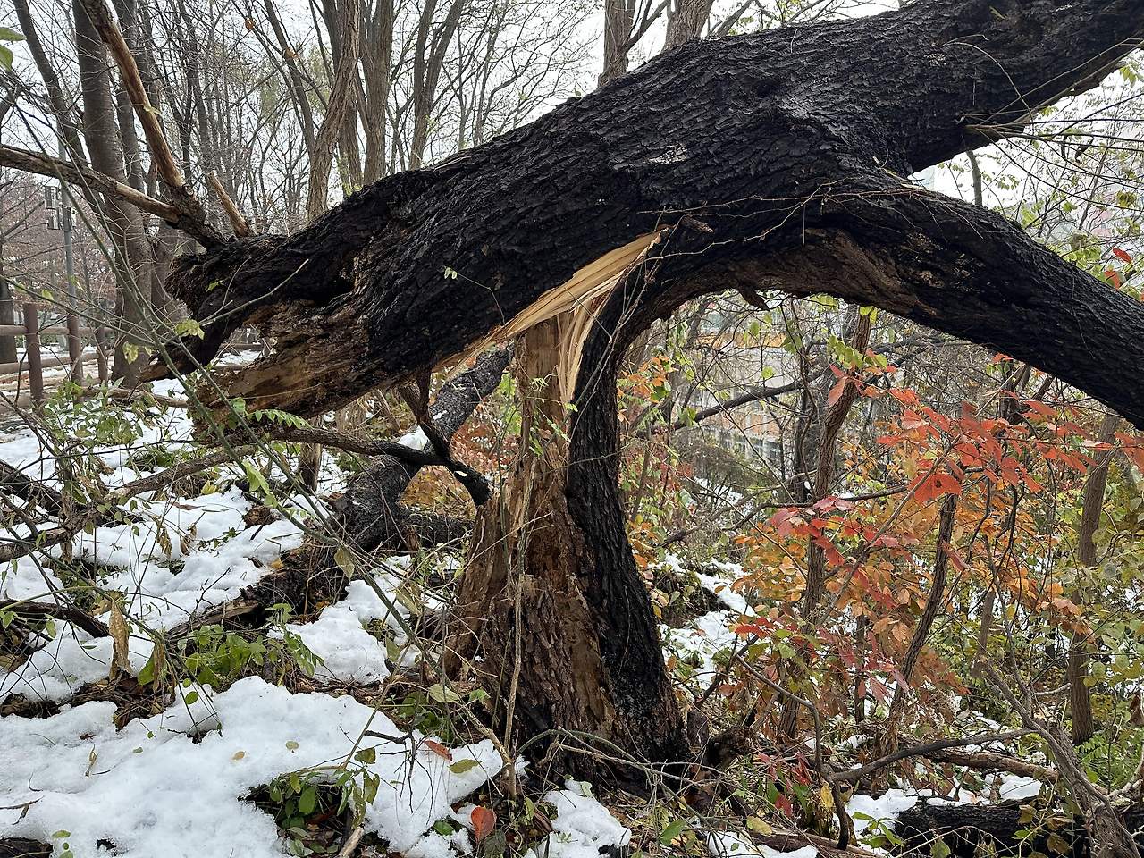 가지 넘어 본 줄기에까지 재해가 번져가리라 본다. 물론 다른 나무들도 마찬가지다. 내가 아끼는 여러 버드나무도 거의 예외 없이 크고 작은 상처를 입었다. 아예 통째 넘어진 소나무와 수양버들도 있었다. 이 작은 숲에서도 처참을 느낄 정도니 큰 숲은 말할 나위도 없겠다. 불가피한 일이고 인간이 뭐라 입댈 처지는 아니지만 나무를 사람처럼 대하는 나로서는 여간 아픈 일이 아니다. 앞으로 상당 기간 위로와 애도 숲 걷기를 해야 할 듯하다. 부러지고 넘어진 모습 그대로를 목격할 테니 말이다. 숲 생명을 함부로 다루는 인간 관리 손길에는 또 얼마나 애통해할까, 벌써 속이 쓰리다.
