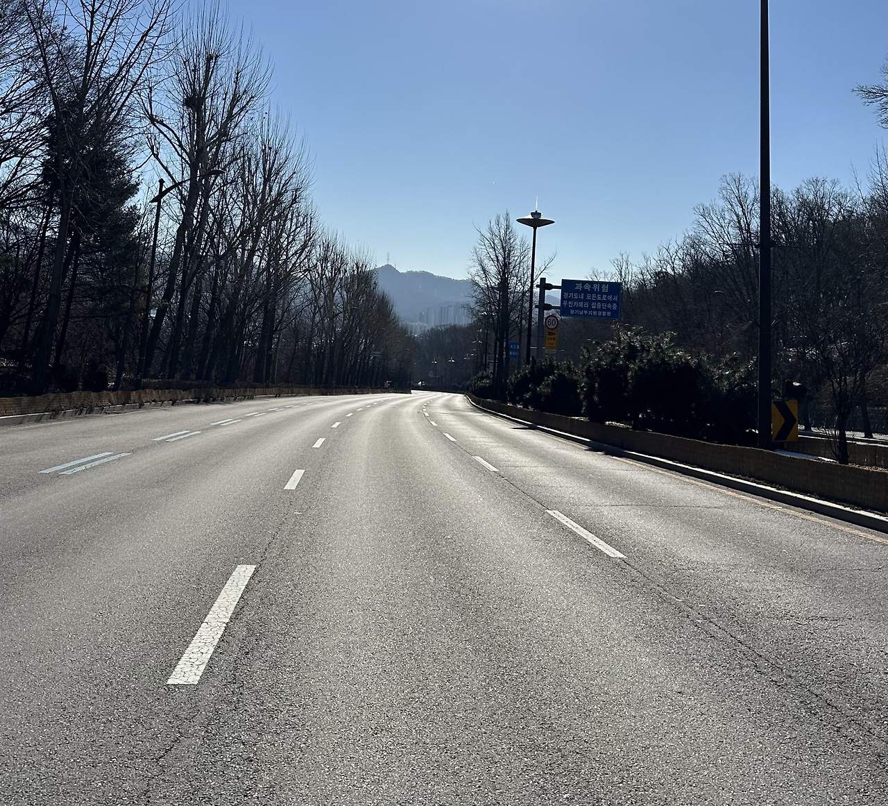 사진과 동영상을 찍어 소식을 알리면서 시간을 살핀다. 점심 식사 하기 위해 따라갈 동선을 생각한다. 지원된 음식을 나같이 부끄러운 늙은이가 축낼 수는 없는 노릇이다. 텅 빈 과천대로가 한눈에 들어온다. 또 언제 어떻게 이 차로 한가운데를 걸어 남태령을 넘을 수 있겠는가. 나는 망설이지 않고 1차선을 따라 걸어 올라간다. 과천 선바위역 근처 음식점에서 점심 먹기로 하고 고갯마루를 향해 간다. 생각보다 남태령은 나지막하다.