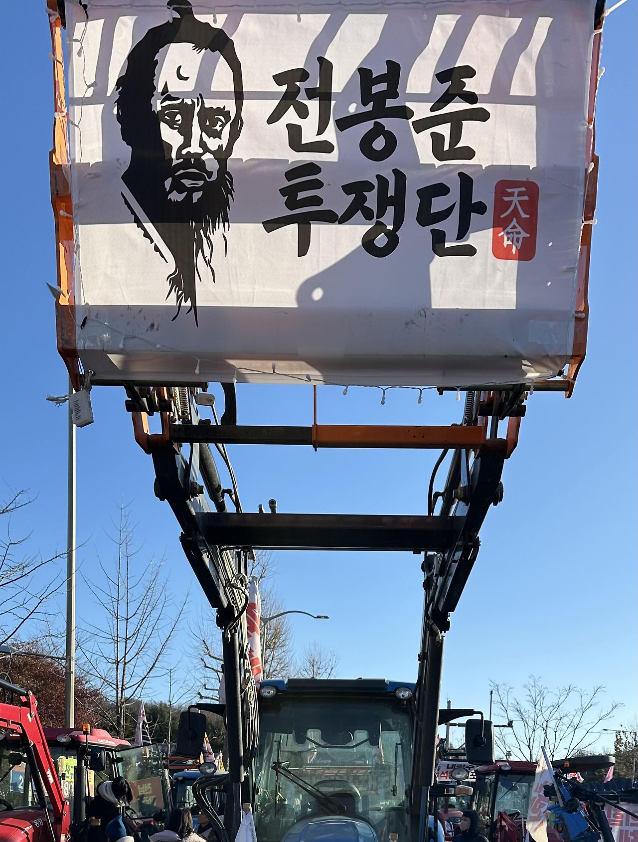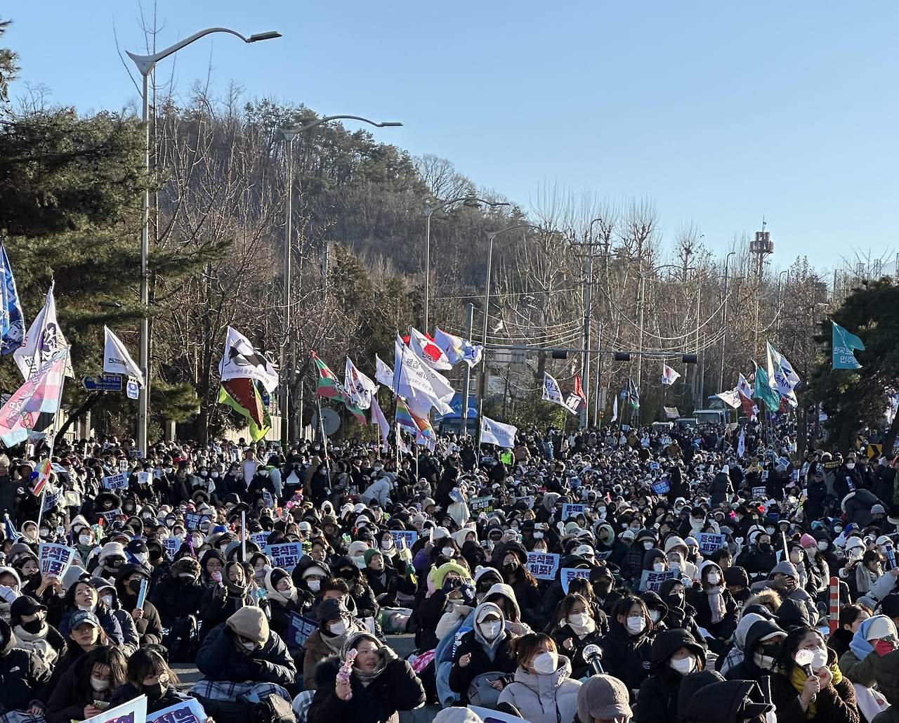경찰 버스로 왕복 8차선 과천대로를 가로막아 놓았다. 그 너머 붉은빛 트랙터들이 마치 장수처럼 서서 금방이라도 내달릴 듯한 긴장감을 자아내고 있다. 늘 그렇듯 농민도 냅다 걷어찬 윤석열을 체포하겠다고 용산을 향해 온 농민과 그들을 지지하는 시민들이 추위에도 아랑곳없이 차가운 아스팔트 위에 앉고 서서 뜨거운 열기를 토해내는 중이다. 사회자가 간간이 지원 물품을 소개하면 열기는 한층 고조된다. 축제도 이런 축제가 없다.