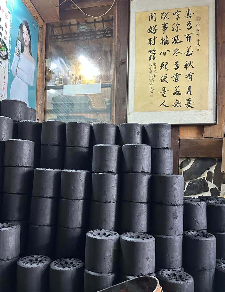 이 시를 발견한 곳은 우이동 어느 쌈밥집이다. 아직도 연탄난로를 쓰는 노포다. 밥 먹다 말고 내가 연탄과 난로 사진을 찍자 다른 곳도 있다며 바깥쪽을 가리킨다. 식당 주 공간 아닌 보조 공간인데 연탄 광으로 쓴다. 거기 벽에 떡하니 이 시 담은 액자가 걸려 있다. 승려가 쓴 것으로 보이는 붓글씨 서체가 특이해 사진에 담았다가 내친김에 번역까지 해 글 들머리 화제부터 삼았으나 시는 오늘 이야기 문을 여닫는 조연일 따름이다. 주인공은 연탄이다.