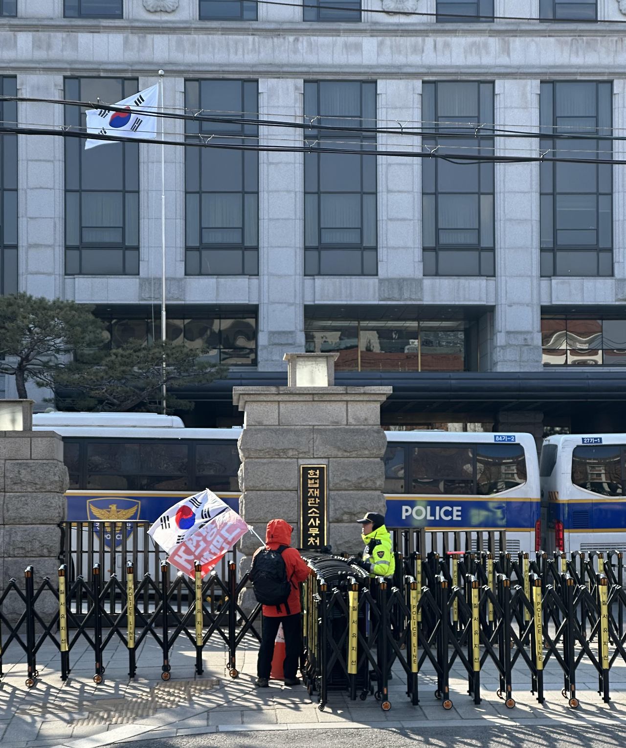 백악 숲을 떠난다. 삼청공원 거쳐 북촌로 따라 내려온다. 이윽고 헌법재판소에 닿는다. 경찰 차량이 빈틈없이 둘러싸고 있다. 군데군데 태극기 든 제국 부역 마름 종자들이 수런거리며 서성인다. 저들이 든 태극기와 헌재 국기 게양대에 걸린 태극기는 어떻게 다른 태극기인지.
