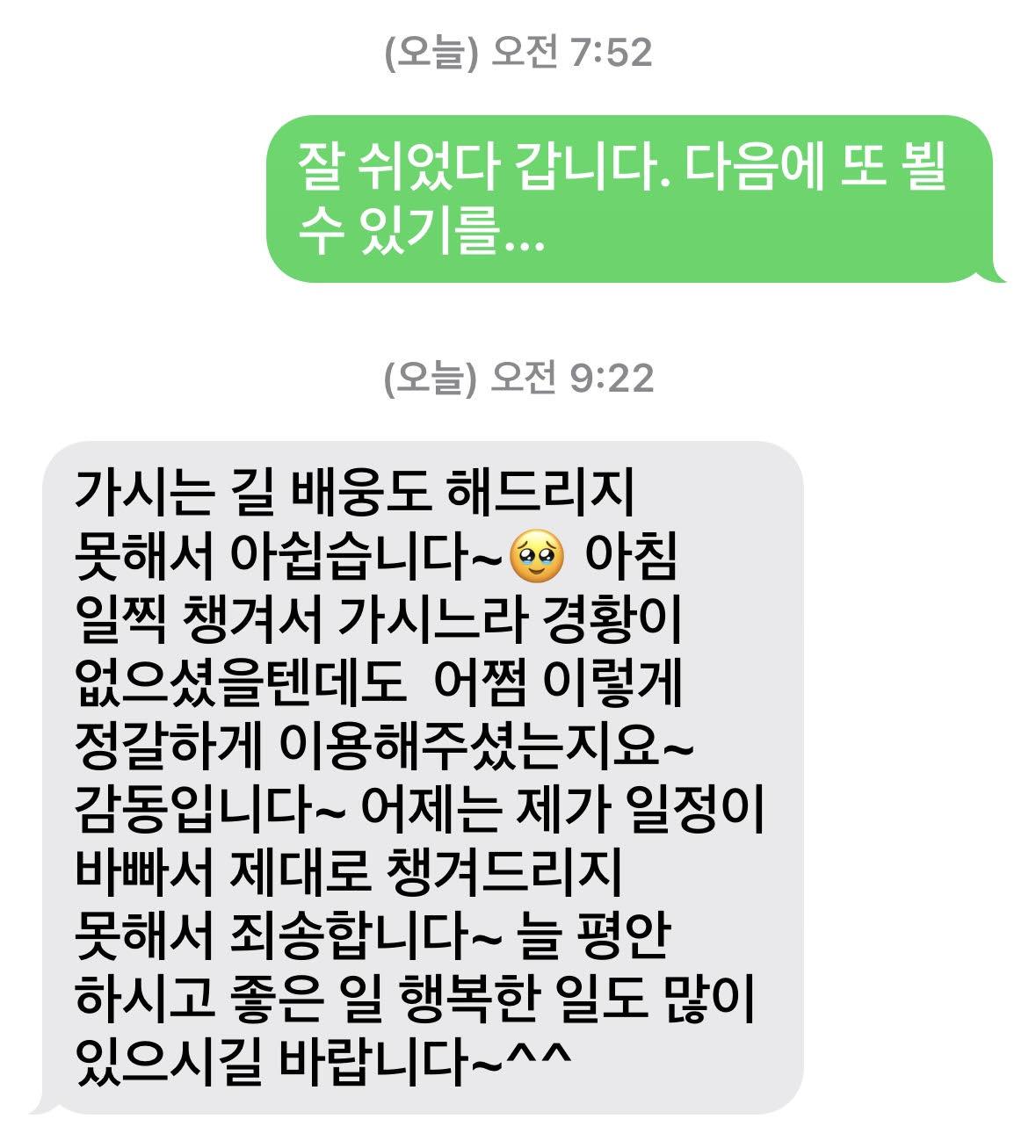 다음 날 아침, 일찍 잠에서 깬다. 전혀 피곤하지 않다. 기상정보를 확인하고 건강 앱을 열어보니 숲과 물을 걸었던 최근 4년 중 가장 많이 걸었다고 나온다: 26.3km. 해가 더 뜨거운 각도로 올라오기 전에 출발한다. 다시 올레길 걸어 공항에 도착한 뒤 숙소 주인에게 인사를 남긴다. 그에게서 온 답글이 가히 화룡점정이다.