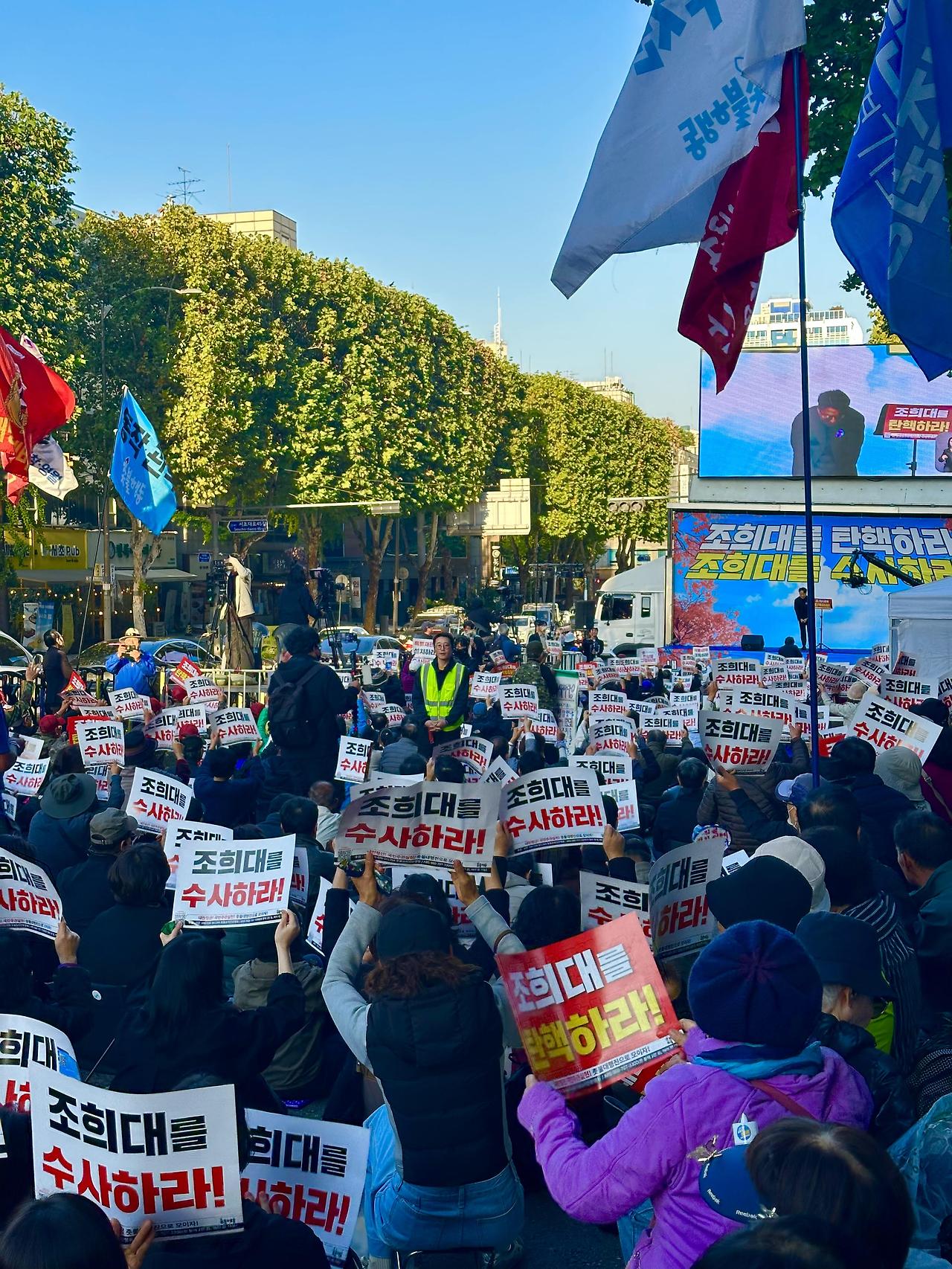 들마에 급히 들어오신 환자분을 치료하느라 늦게 도착한 광장은 열기가 사뭇 고조되어 있다. 사회자가 외치는 고주파 음이 일대를 멀리까지 뒤흔든다. 민주주의 최후 보루라던 사법부가 내란 세력 최후 보루가 돼버린 상황이라 시민 경각심은 다시없이 날카롭다. 분노를 가라앉히지 못한 시민들이 이곳저곳에서 불쑥불쑥 욕설 같은 외마디 소리를 뱉어내곤 한다. 나도 이전보다 더 큰 목청을 낸다. 게다가 최근 집회 가운데 가장 큰 규모라 경찰이 드러내는 긴장도도 다르다.