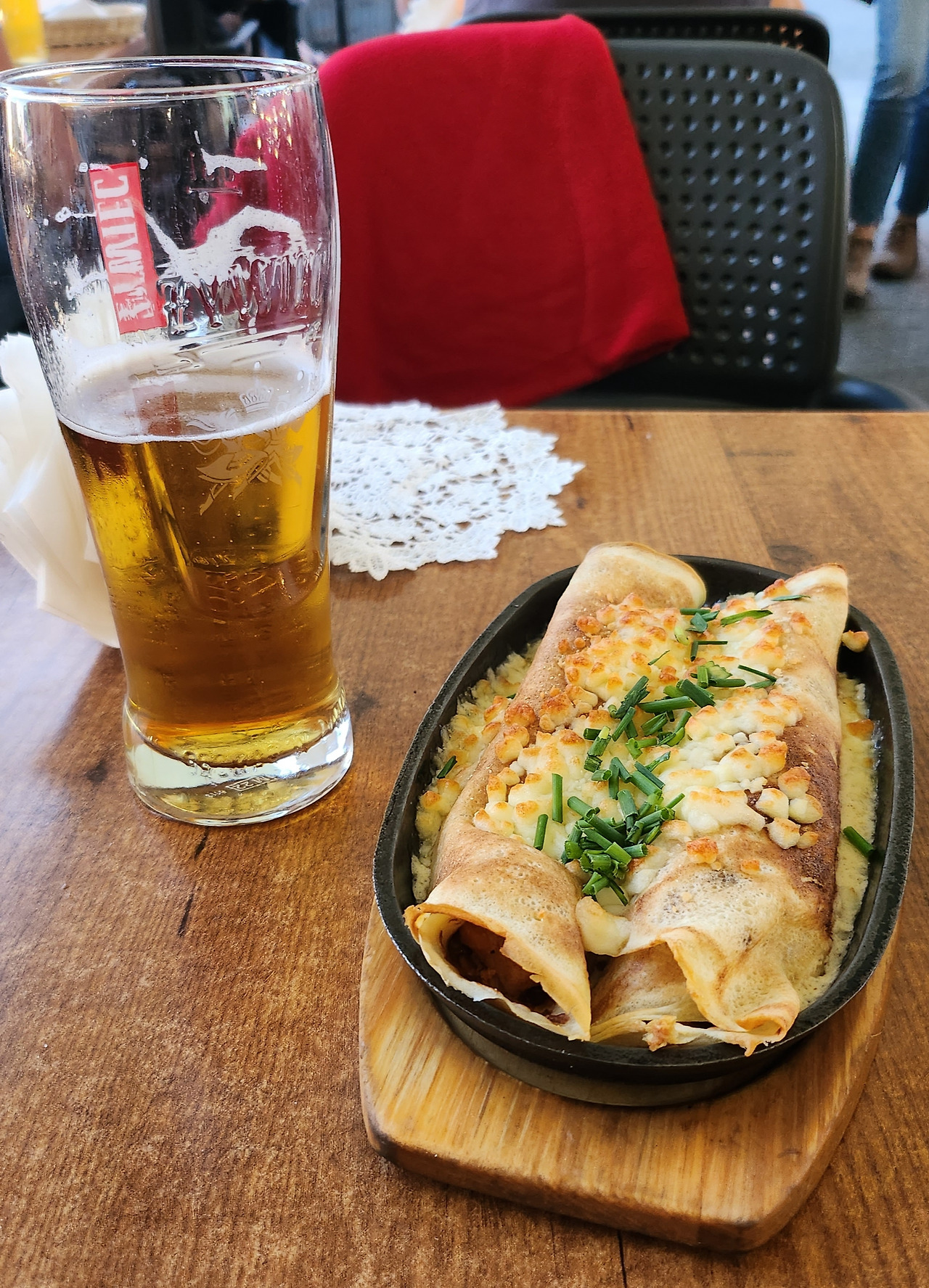 맛집을 전혀 찾아보지 않았었기 때문에, 숙소에 와서야 주변에 어떤 식당이 있나 찾아보았다. 일단 폴란드에 왔으니 폴란드 음식을 먹어야겠다는 생각에 폴란드 전통음식점 위주로 검색했다. 구글맵 평점이 좋은 GOŚCINIEC이라는 식당이 숙소 맞은편에 있길래 바로 들어갔다. 웨이터의 안내를 받아 구석진 야외 테이블에 자리를 잡았다. 메뉴판을 펼쳤는데, 딱히 끌리는 음식이 없었다. 결국 뭔가 낯익어 보이는 크레페와 Zywiec 맥주 한 잔을 주문했다. 직원이 소스와 고기 종류를 물어보길래 가장 인기 있는 걸로 해달라고 했다. 그리고 이것을 매우 후회했다. 돼지고기가 들어간 크림소스 크레페가 나왔는데, 너무 느끼했다. 맥주를 같이 시켜서 다행이지 하마터면 절반도 못 먹고 남길 뻔했다. 그래도 이번 여행의 첫 유럽 음식인 만큼 다 먹으려고 무진 애를 썼다. 그 작은 그릇을 비우는 데에 과장 보태서 30분은 걸렸는데, 그동안 노을을 감상했다. 도로 양쪽에 쭉 늘어선 파스텔 톤의 낮은 건물들 사이에 보이는 분홍색 하늘 덕에 음식을 다 먹을 수 있었다.